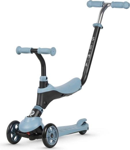 Qplay Sema je chytré řešení pro první krůčky mobility: od jízdního režimu se sedátkem a rodičovskou rukojetí pro nejmenší, přes bilanční koloběžku až po samostatnou dětskou koloběžku. Dvě velká přední kola zvyšují stabilitu, nízká nášlapná plocha usnadňuje nasedání a brzda na zadním kole se postará o rychlé a bezpečné zastavení.
