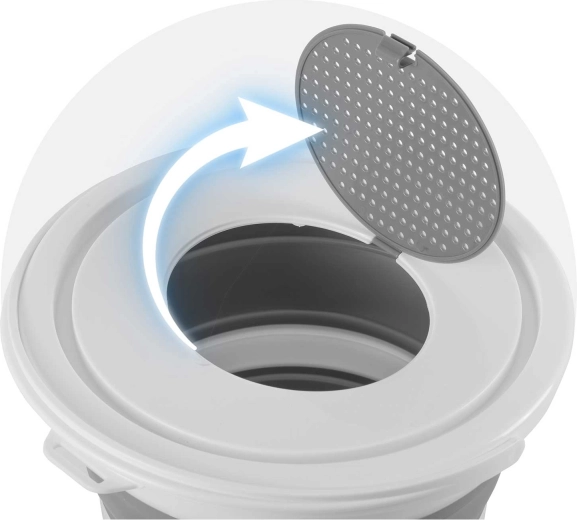 Praktické víko s výklopnou klapkou a sítkem zabraňuje vyšplíchnutí a umožňuje slévat vodu, přecedit a oplachovat bez nutnosti sejmout celé víko. Díky možnosti částečného rozložení snadno zvolíte menší objem pro drobné práce, nebo plných 10 litrů pro praní, mytí podlah a péči o auto.