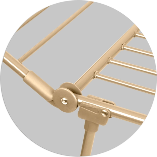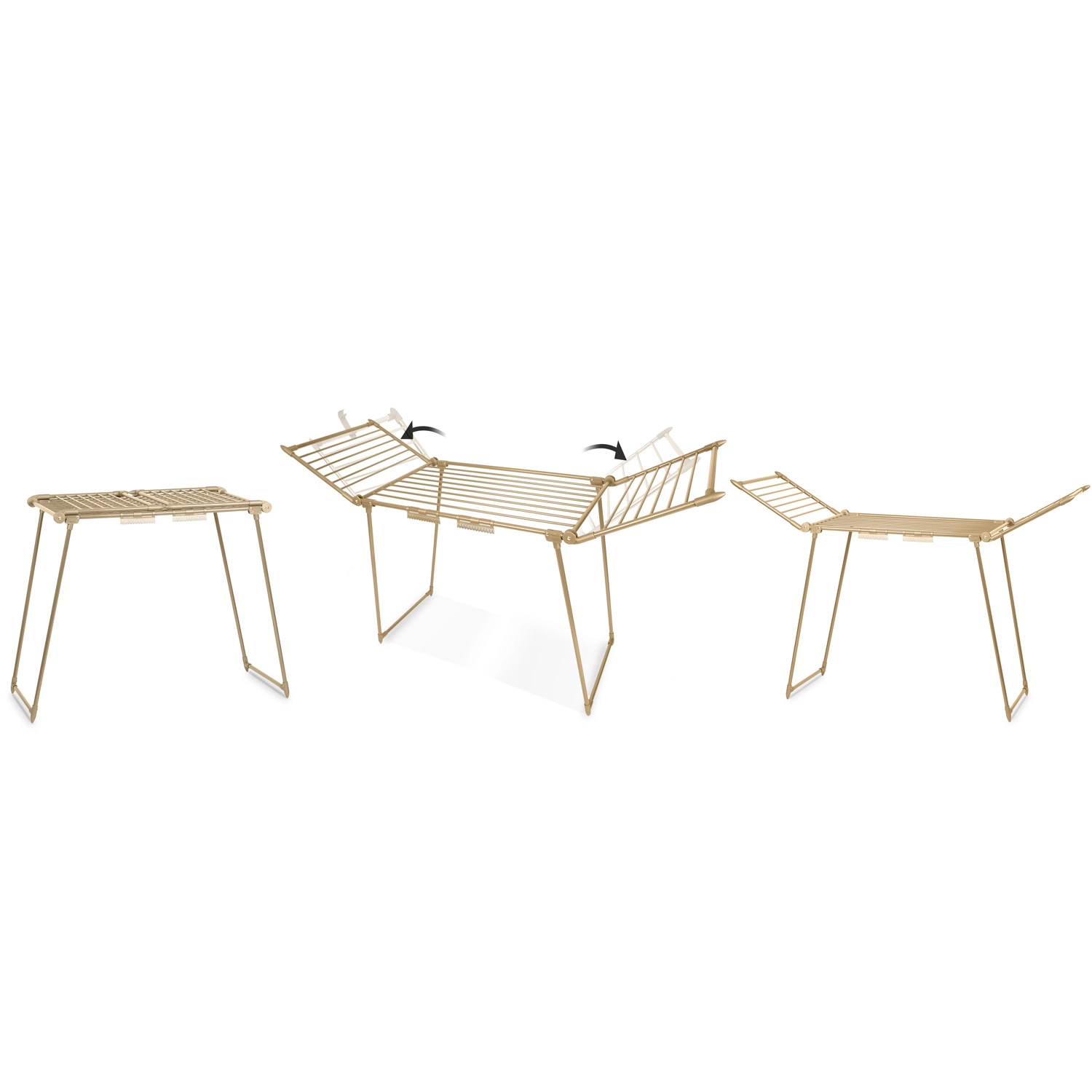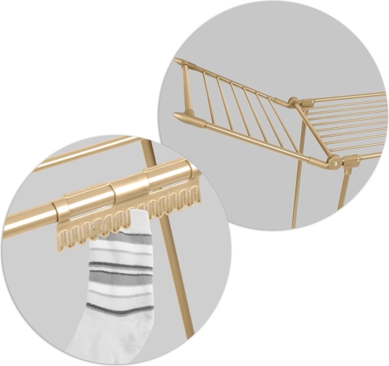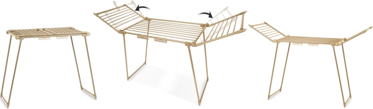 Massido Debora Gold spojuje funkčnost a eleganci. Kovová konstrukce se zlatým metalickým povrchem je odolná, stabilní a snadno se udržuje. Široce rozmístěné silné příčky zmenšují pomačkání textilií a podporují rychlejší proudění vzduchu pro rovnoměrné schnutí bez nutnosti žehlení.