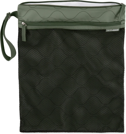 Už žádné promáčené tašky ani nepořádek. Voděodolný sáček SKIP HOP Grab & Go v odstínu Dark Sage nabízí dvě oddělené zipové části pro mokré a suché věci. Přední síťovaná část zajišťuje circulaci vzduchu a přehled o obsahu, zatímco horní komora bezpečně uloží mokré či špinavé předměty.