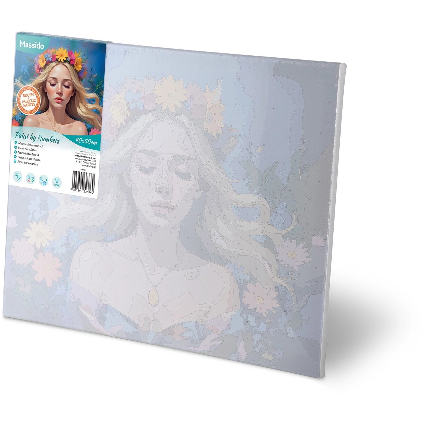 Předtištěné plátno na rámu, 30 akrylových barev, 3 štětce a háčky na zavěšení. Otevřete balení a začněte tvořit bez dalších nákupů.