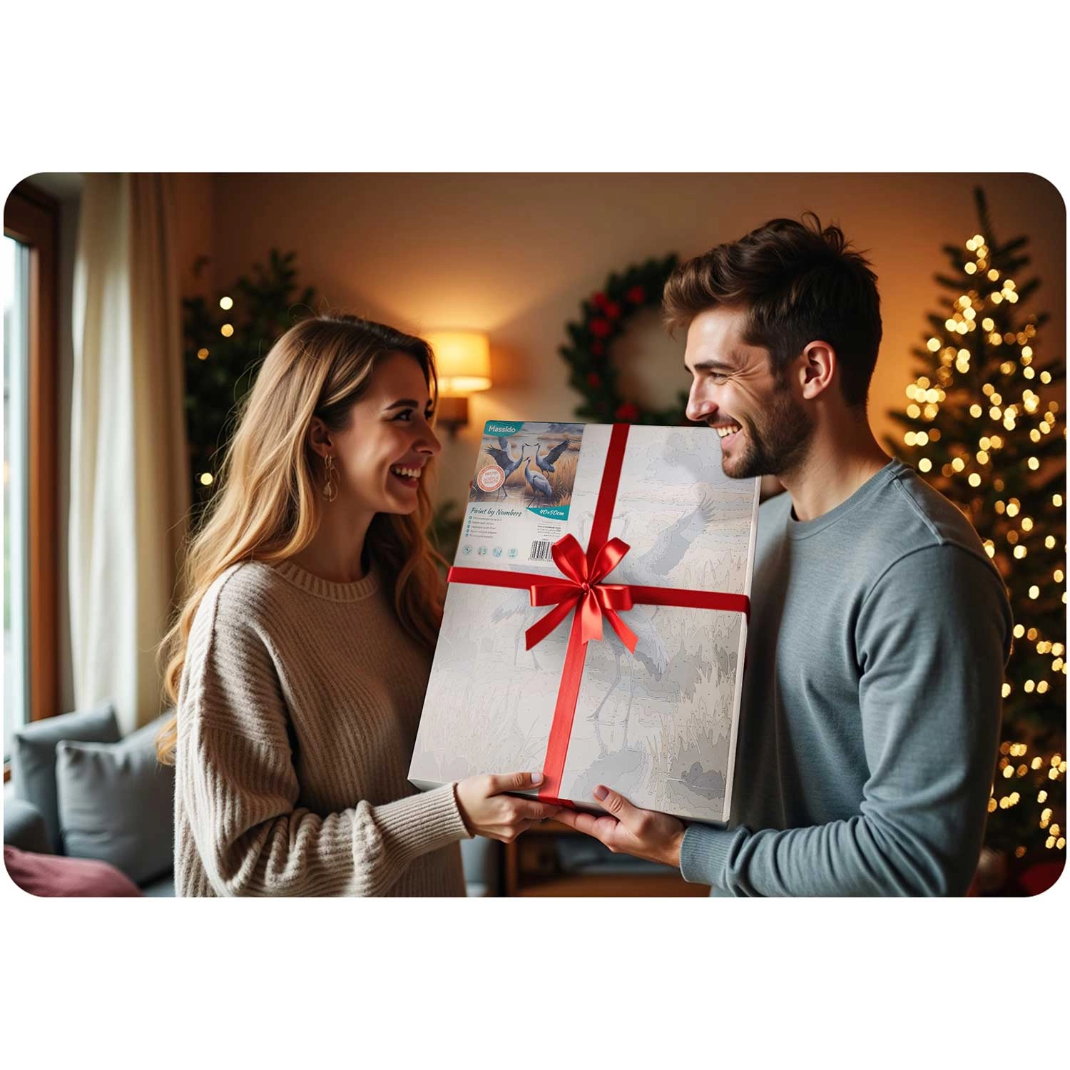 V balení najdete vše, co potřebujete: plátno 40 × 50 cm na dřevěném blindrámu, 30 očíslovaných kelímků s barvami, 3 štětce různých velikostí pro detaily i plochy, papírovou předlohu A4 a háčky s šroubky pro snadné zavěšení hotového obrazu.