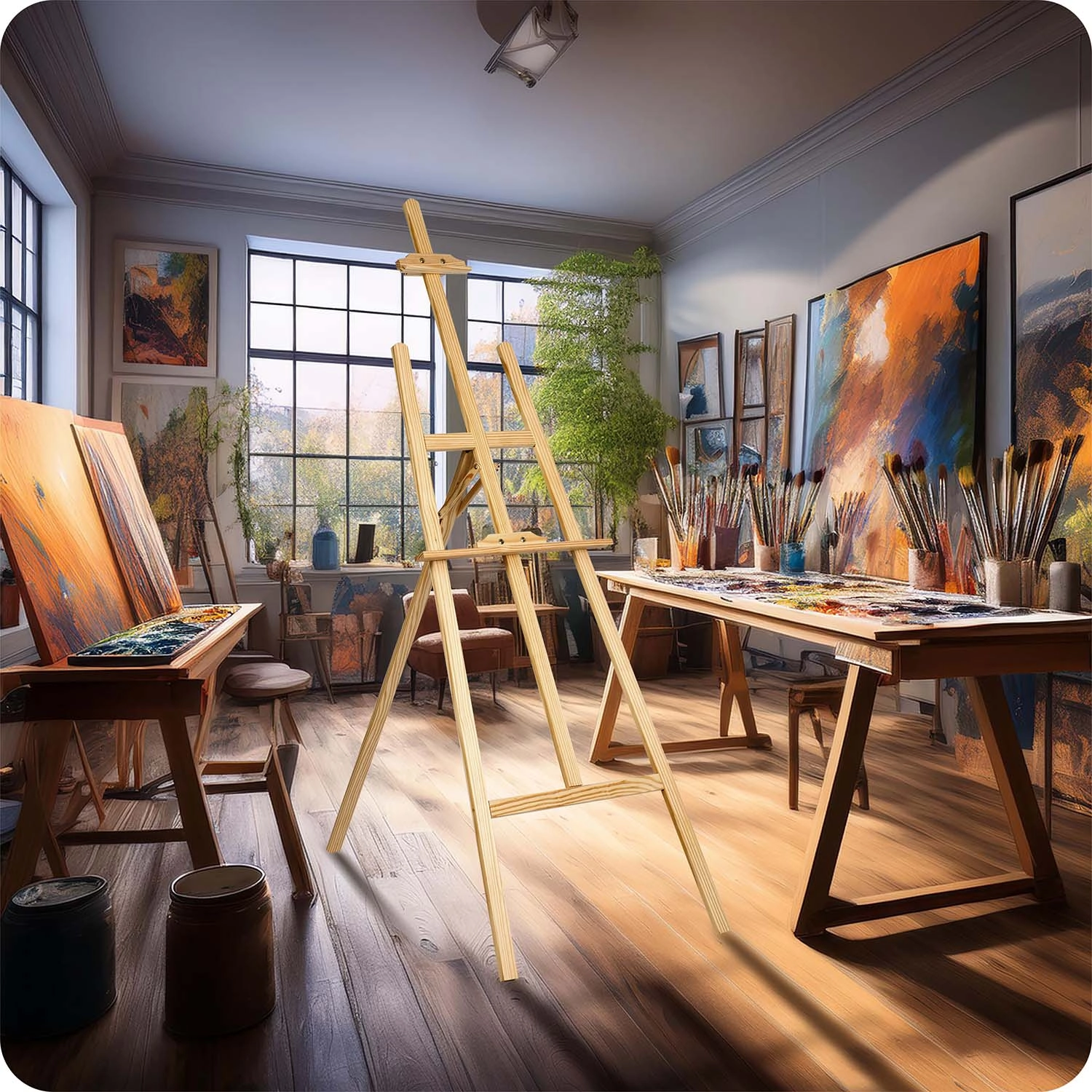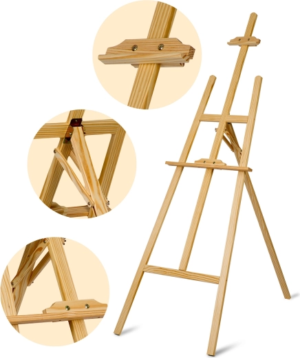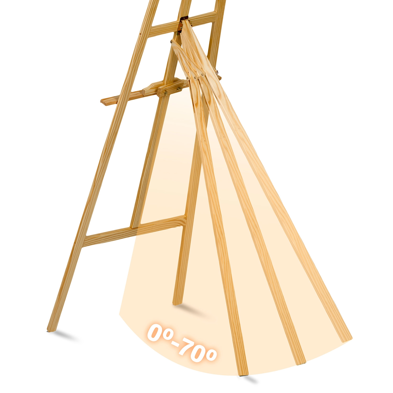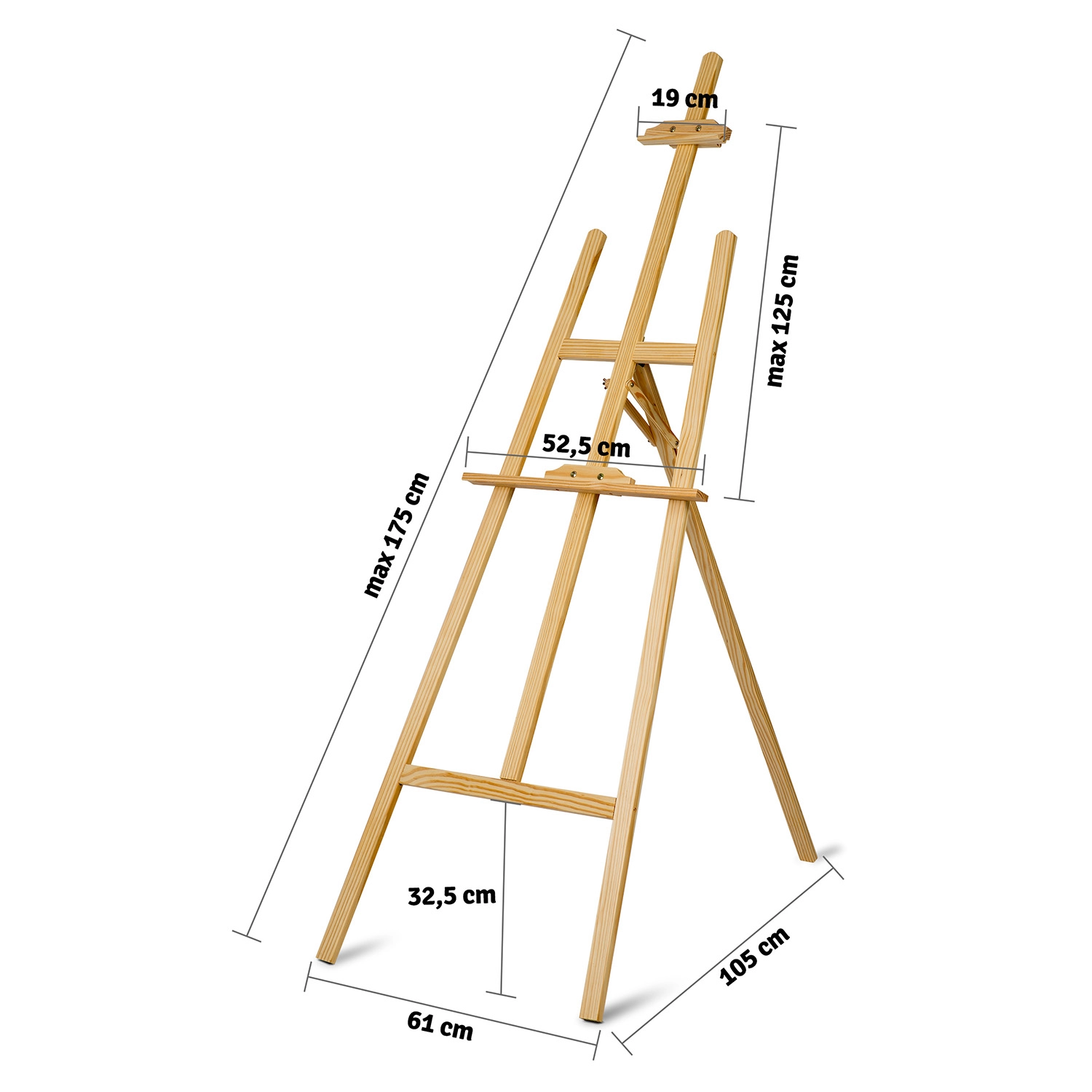 Univerzální malířská stojanová štafle MASSIDO o výšce 175 cm je ideální pro začátečníky i profesionály. Nabízí stabilní dřevěnou konstrukci, plynulé nastavení výšky a úhlu 0–70° a pojme plátna až do 125 cm. Díky skládací a lehké konstrukci je perfektní do ateliéru, domova i do plenéru.