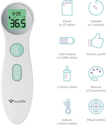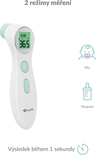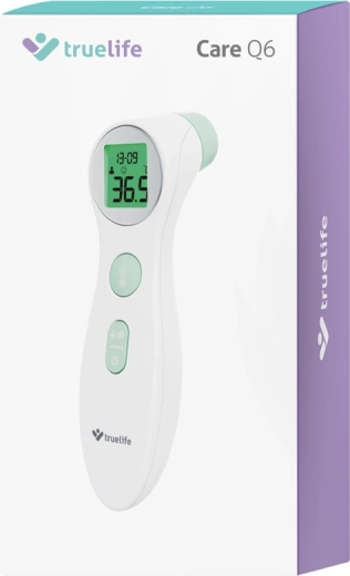 Rychle, hygienicky a bez dotyku. Bezkontaktní infračervený teploměr TRUELIFE Care Q6 změří teplotu do 1 sekundy s přesností ±0,1 °C. Nabízí 2 režimy měření – pro tělo i pro předměty a tekutiny, přehledný LCD displej s barevným podsvícením a indikaci horečky. Pamatuje si 10 posledních měření a na jedny baterie zvládne až 6 000 měření.