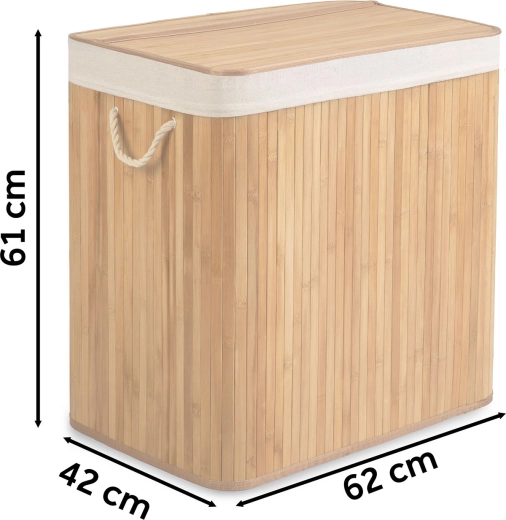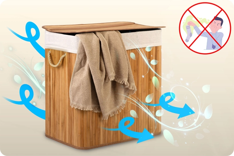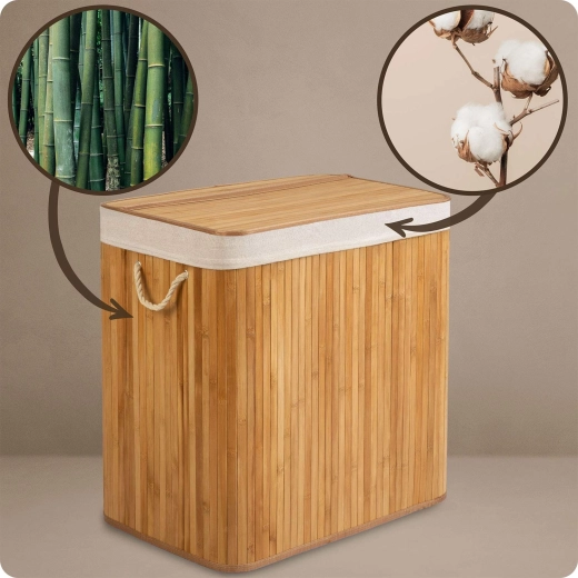 Přírodní bambus a prodyšná bavlna podporují cirkulaci vzduchu a pomáhají omezit vlhkost i nežádoucí pachy. Promyšlené detaily jako pevné lanóvé ucha, odnímatelné víko, vyjímatelný vak s možností zavázání a stabilní plné dno dělají z koše odolného každodenního pomocníka.