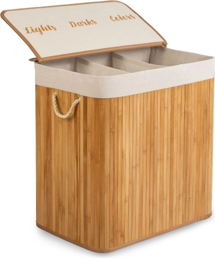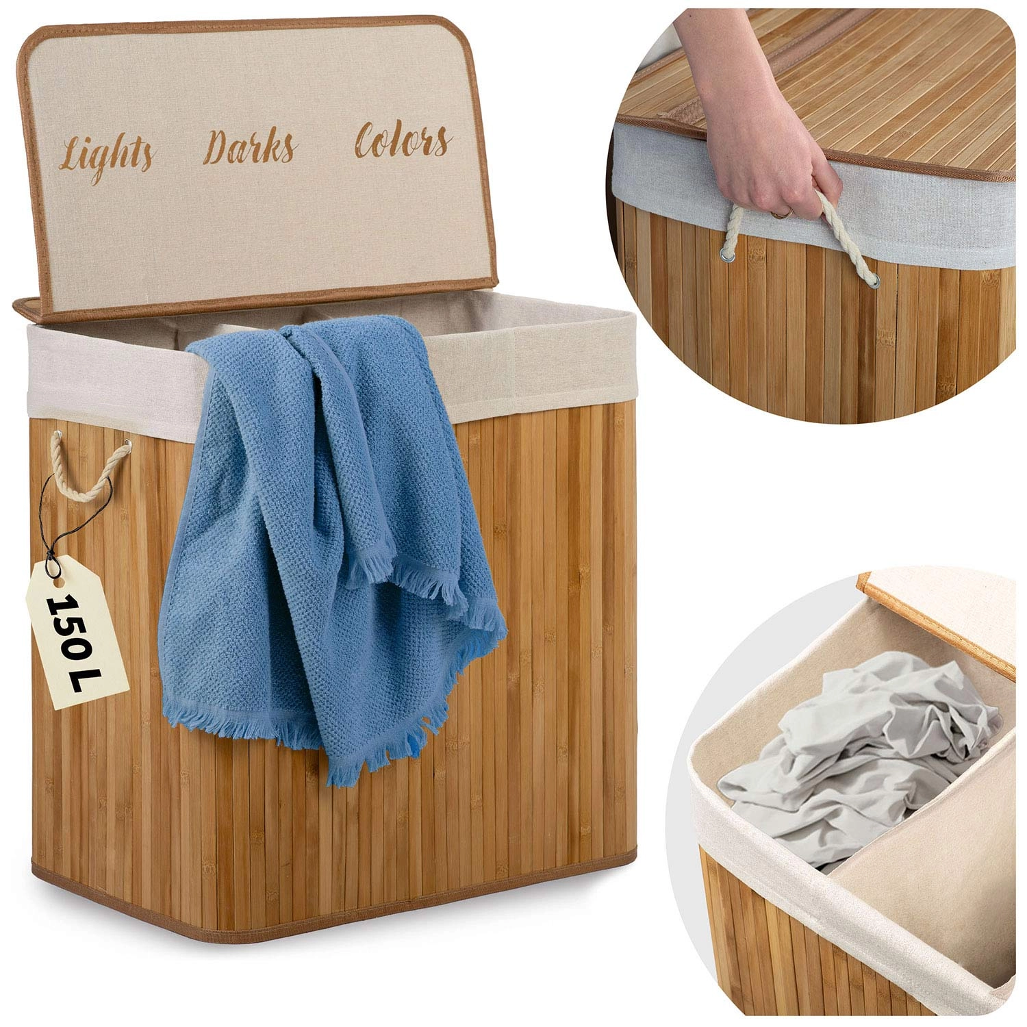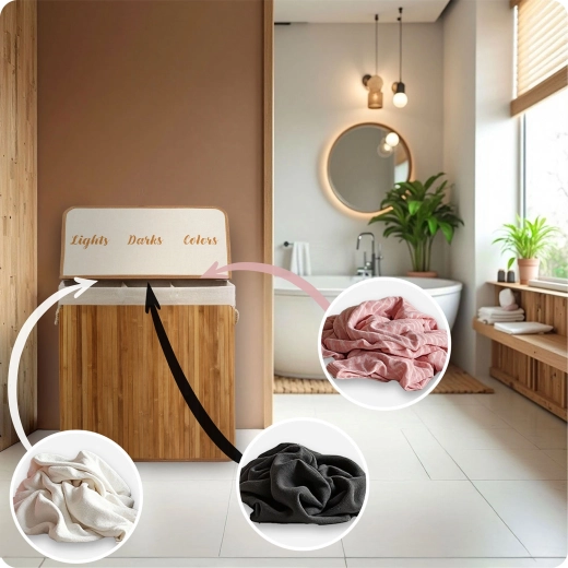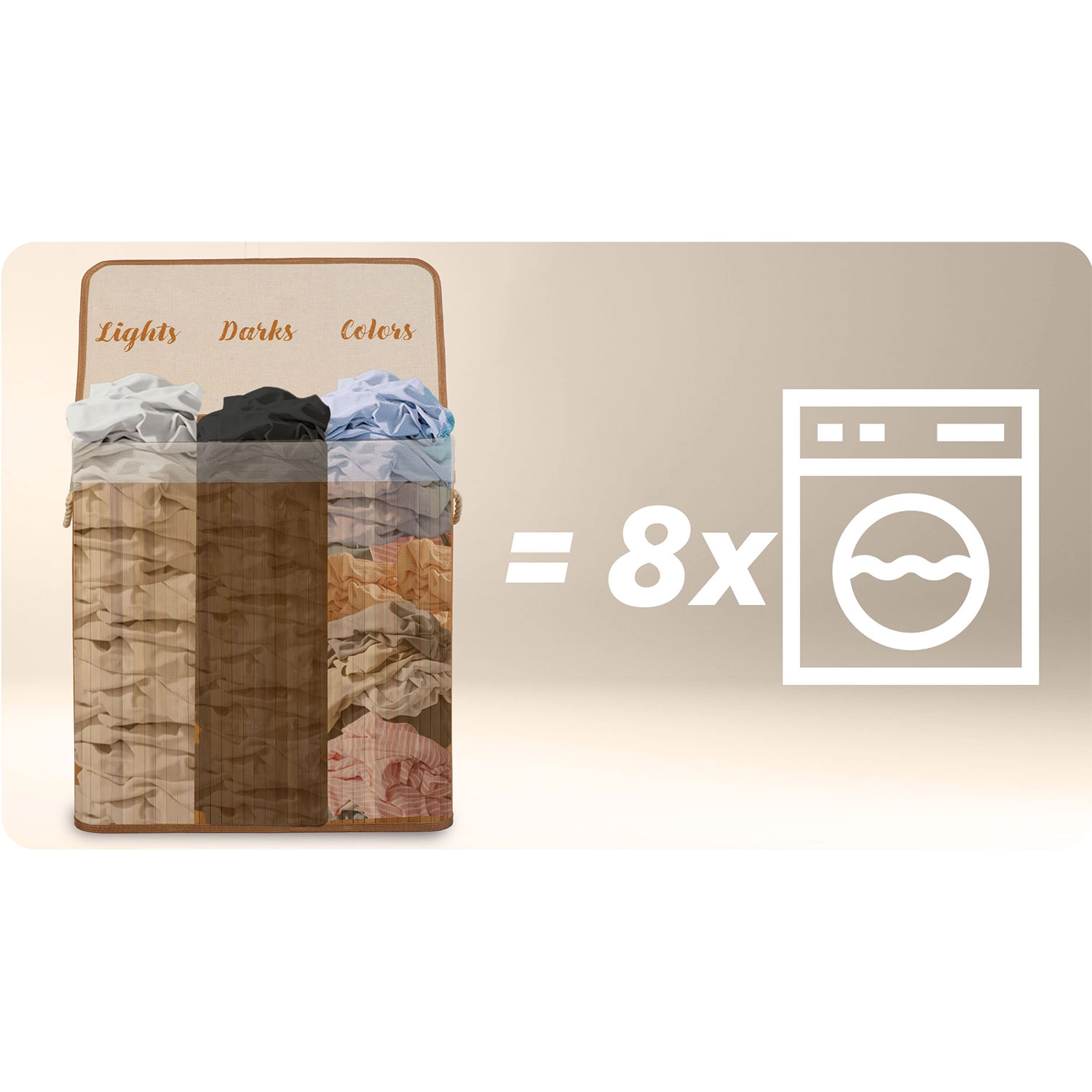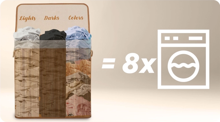 Maximální praktičnost a přehledné třídění prádla v jednom. Koš nabízí kapacitu 150 litrů – pojme až obsah několika praní – a tři jasně oddělené sekce s praktickým značením uvnitř víka: Lights, Darks, Colors. Díky tomu šetříte čas i nervy těsně před praním.