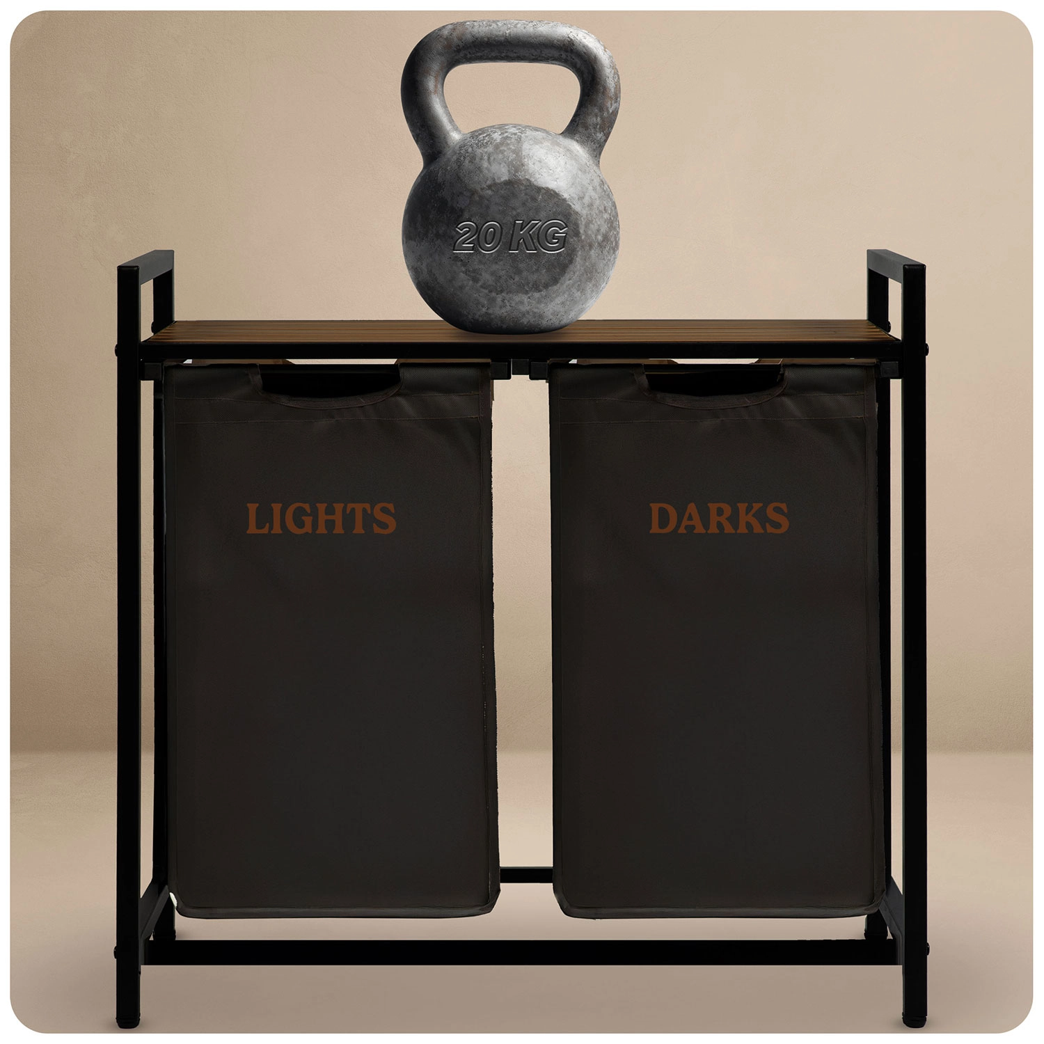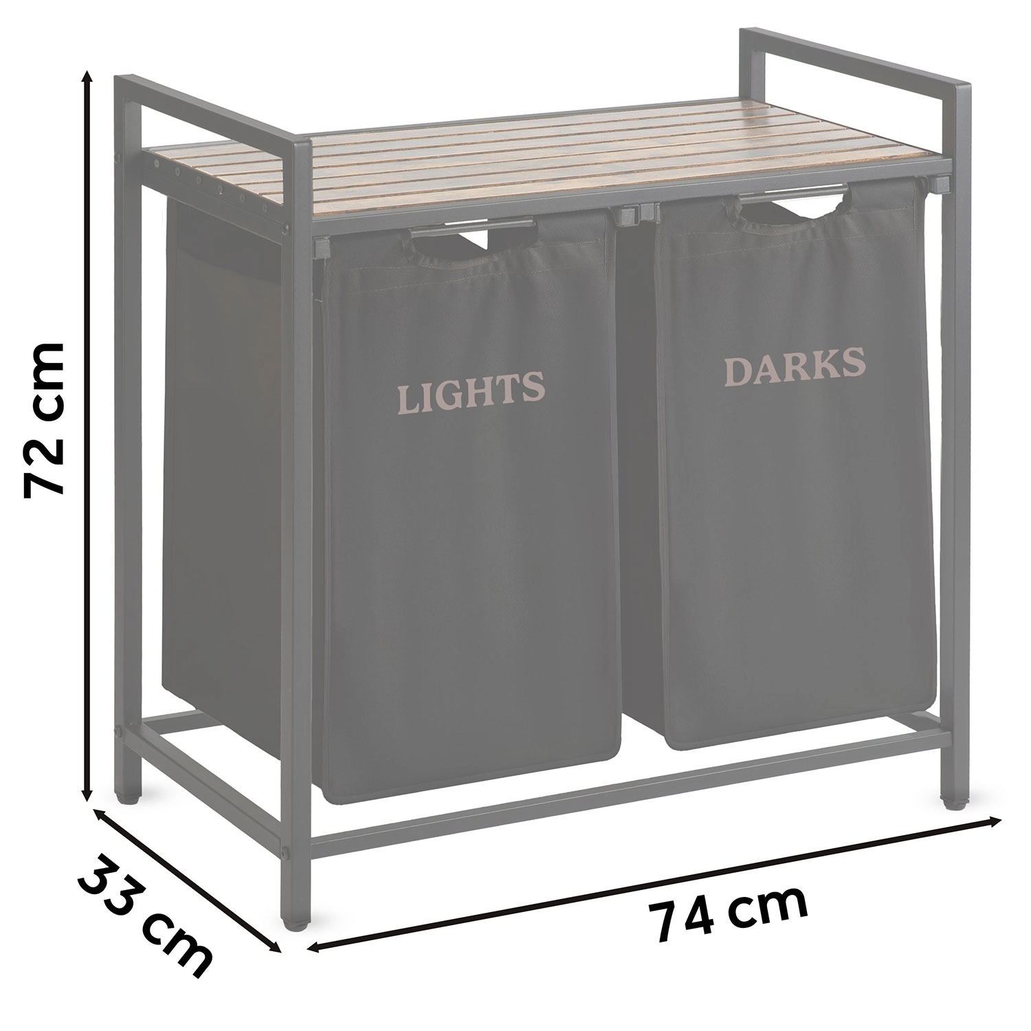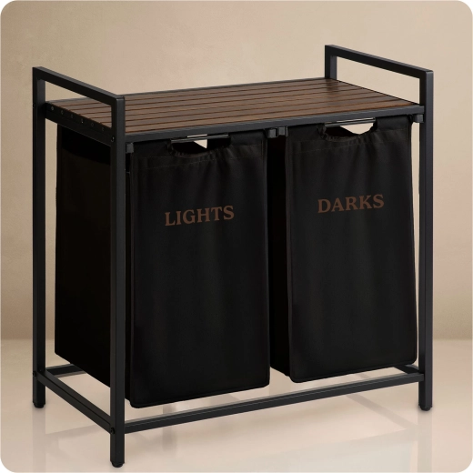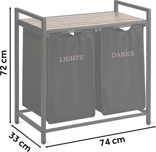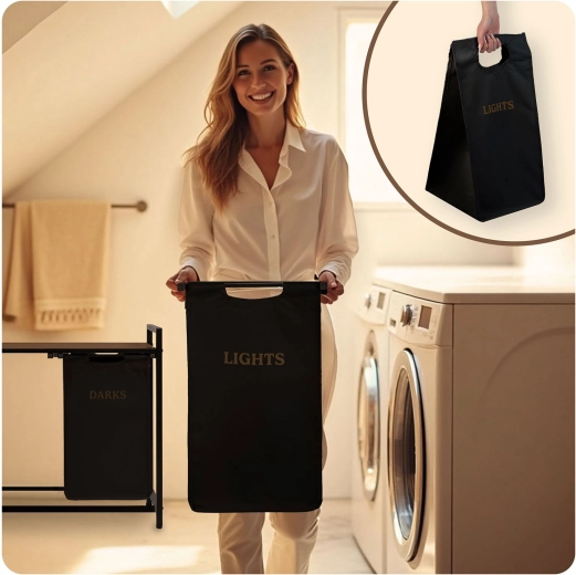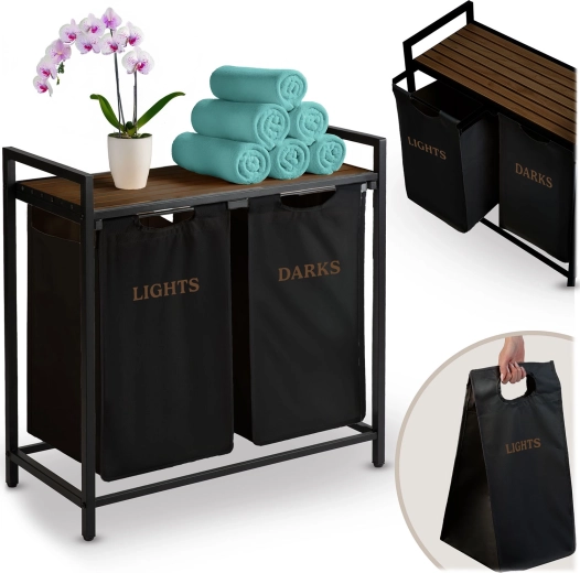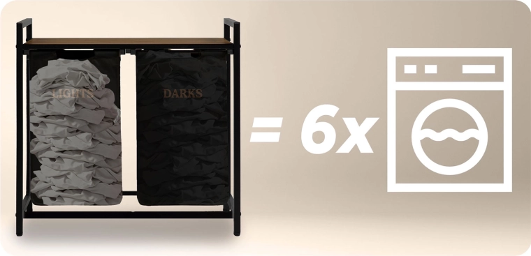 Díky dvěma samostatným textilním košům označeným „Lights“ a „Darks“ třídíte prádlo hned při odkládání – žádné zdlouhavé dělení před praním. Horní police z přírodního dřeva nabízí prostor pro detergenty, koše s ručníky či drobné spotřebiče a unese až 20 kg.