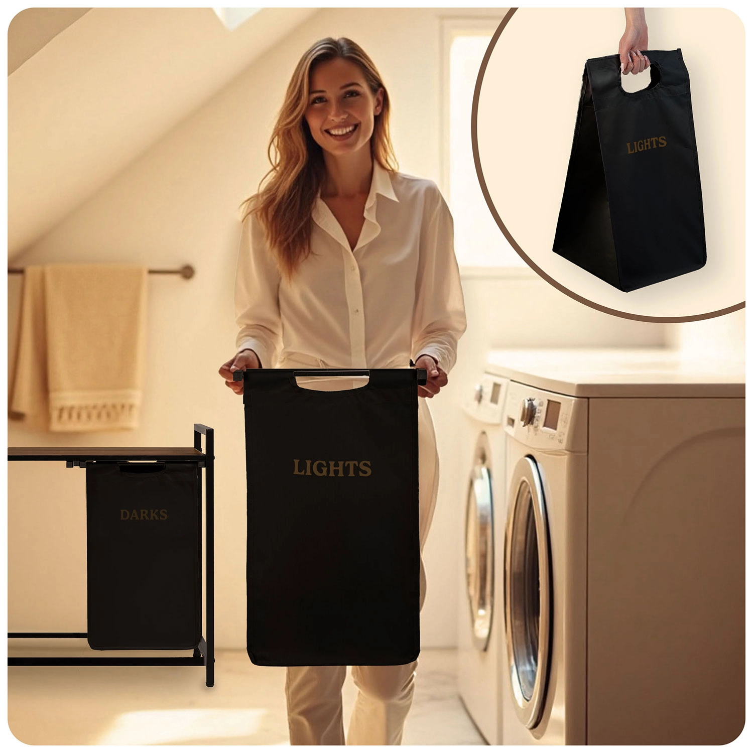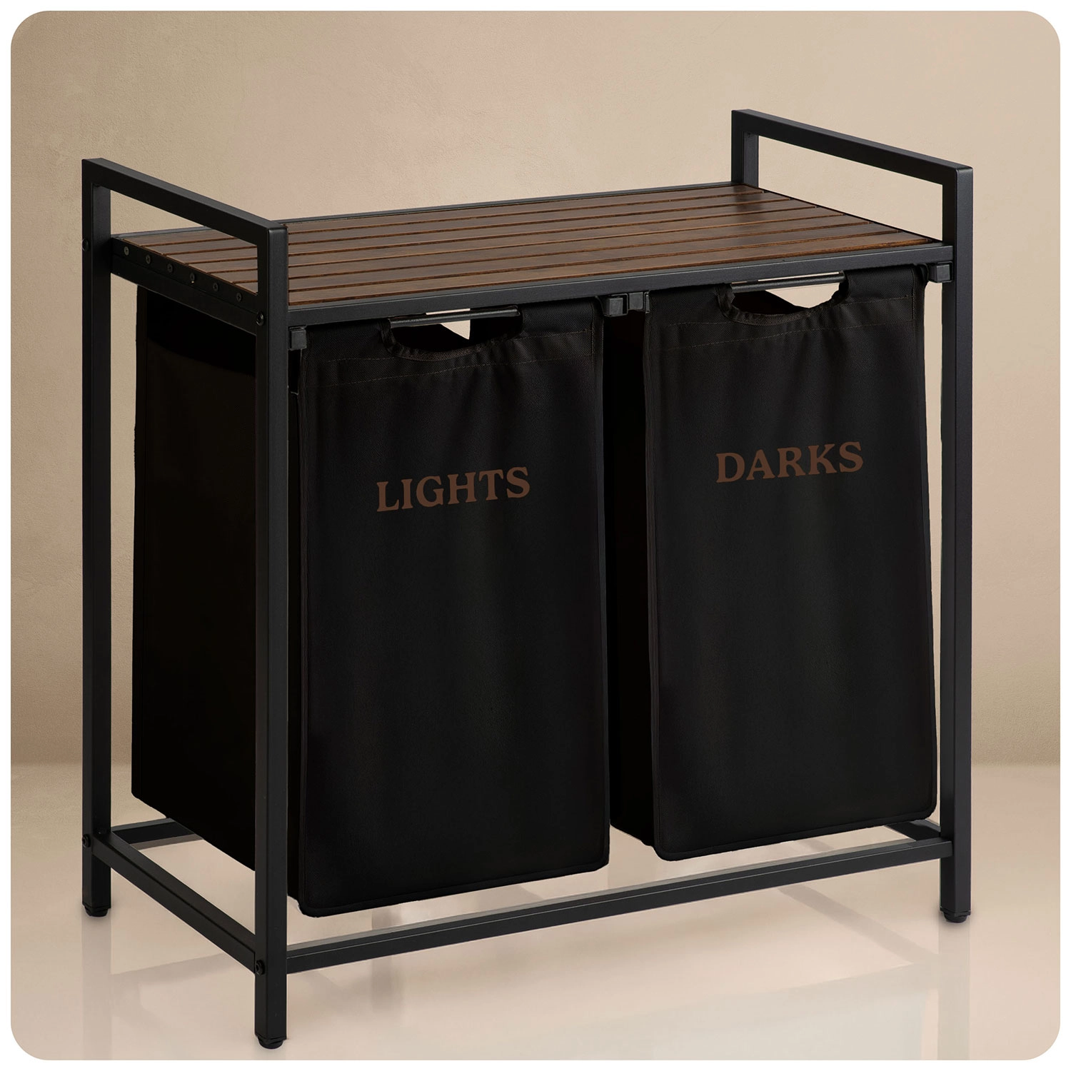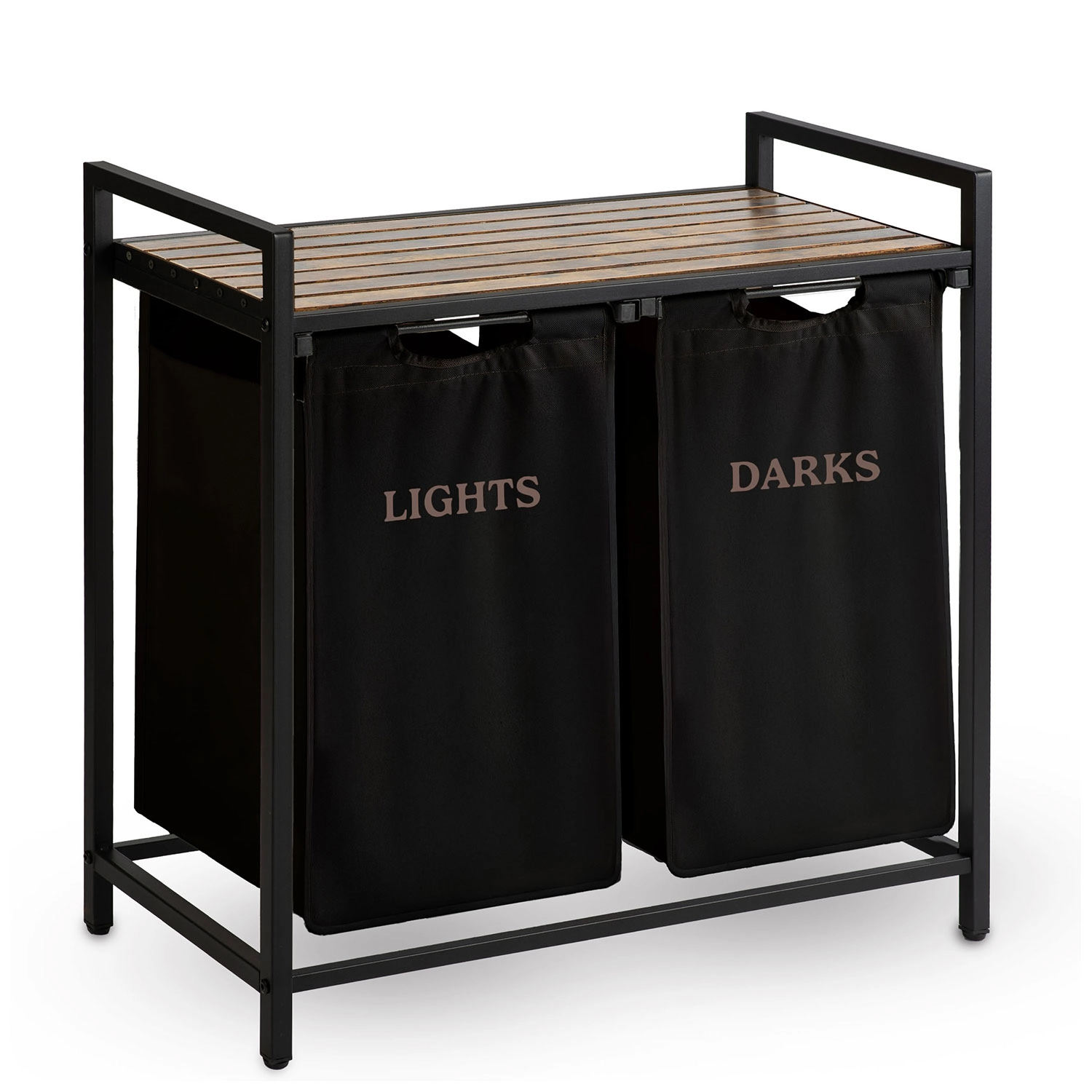 Díky dvěma samostatným textilním košům označeným „Lights“ a „Darks“ třídíte prádlo hned při odkládání – žádné zdlouhavé dělení před praním. Horní police z přírodního dřeva nabízí prostor pro detergenty, koše s ručníky či drobné spotřebiče a unese až 20 kg.