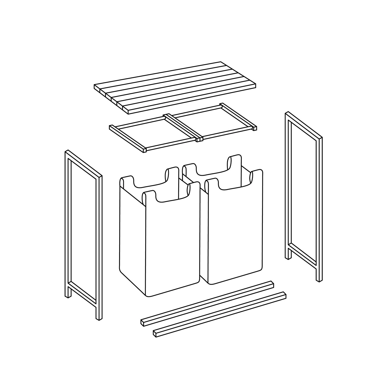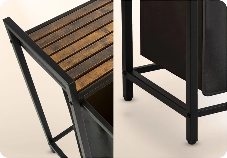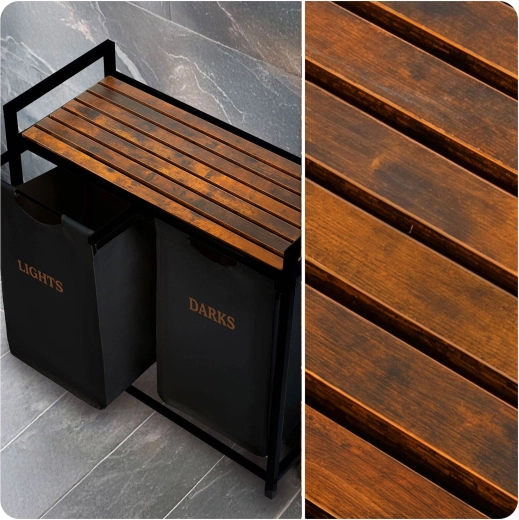 Rám z práškově lakované oceli je odolný proti korozi, poškrábání a oděru, dřevěná deska je odolná vůči vlhkosti a plísním. Vyjímatelné vložky s praktickými uchy promění koš v přenosný pytel – jednoduše vyndáte a přenesete k pračce bez nepořádku.