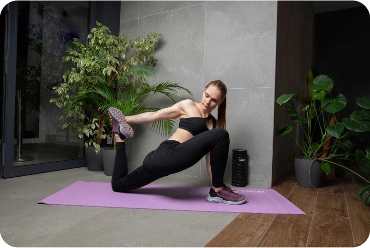 Texturovaný povrch zvyšuje přilnavost rukou i nohou a brání posunu podložky na podlaze. Stabilita při pozicích i během dynamických sekvencí.