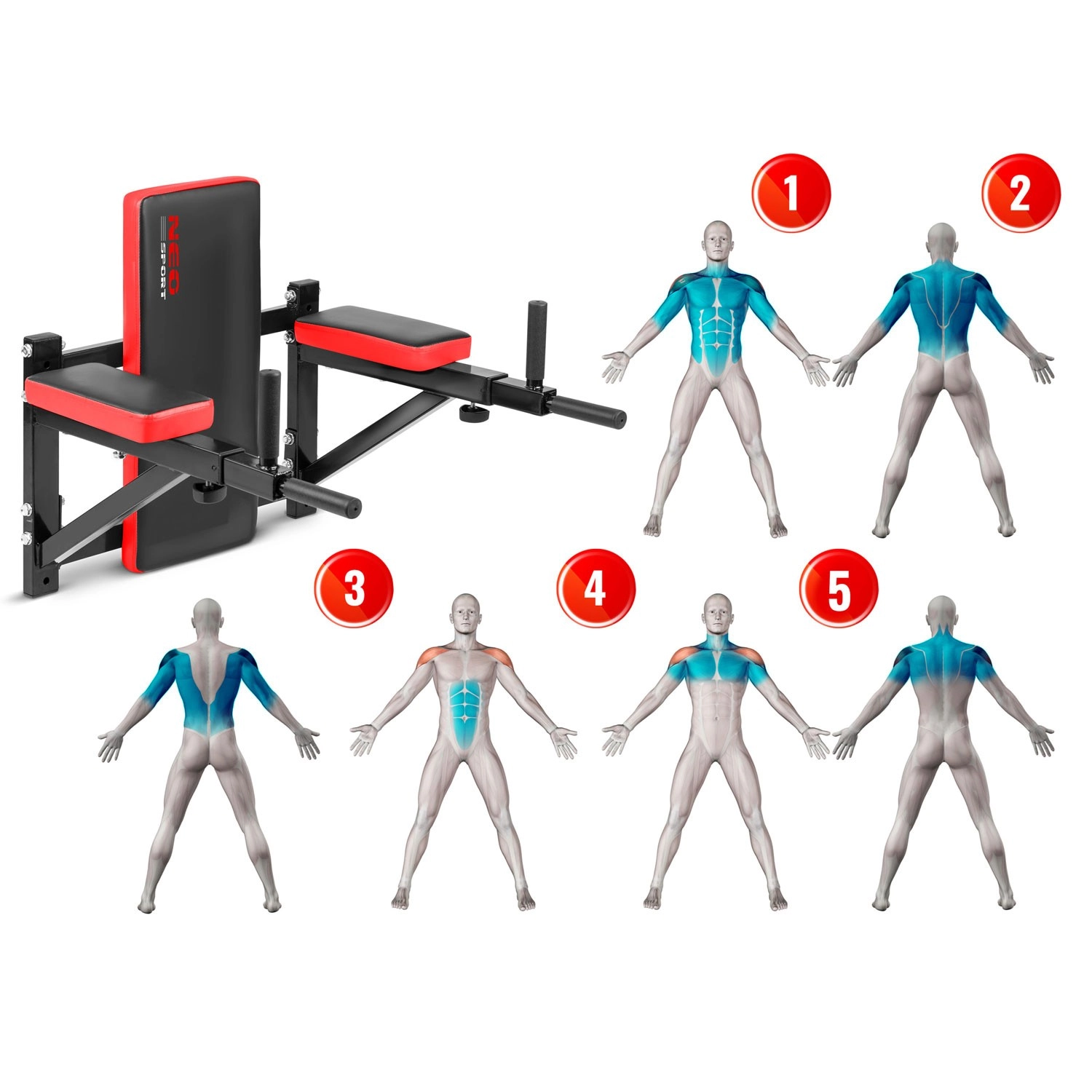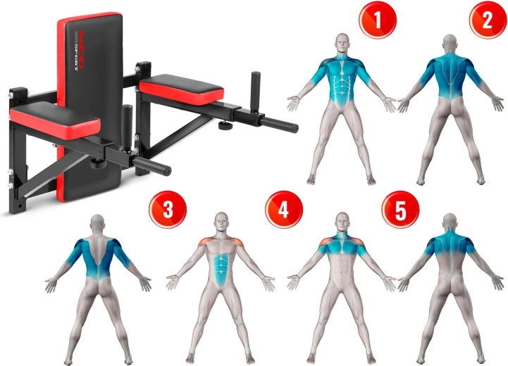 Proměňte svůj pokoj v domácí posilovnu s nástěnnou stanicí NEO SPORT NS-320. Nabízí multifunkční trénink 5 v 1 pro břicho, záda, ramena i hrudník, pohodlné polstrování a protiskluzové úchopy pro jistotu a komfort. Díky pevné ocelové konstrukci a snadné montáži s přiloženým setem kotvících šroubů získáte stabilní a bezpečné vybavení pro efektivní trénink s vlastní vahou.