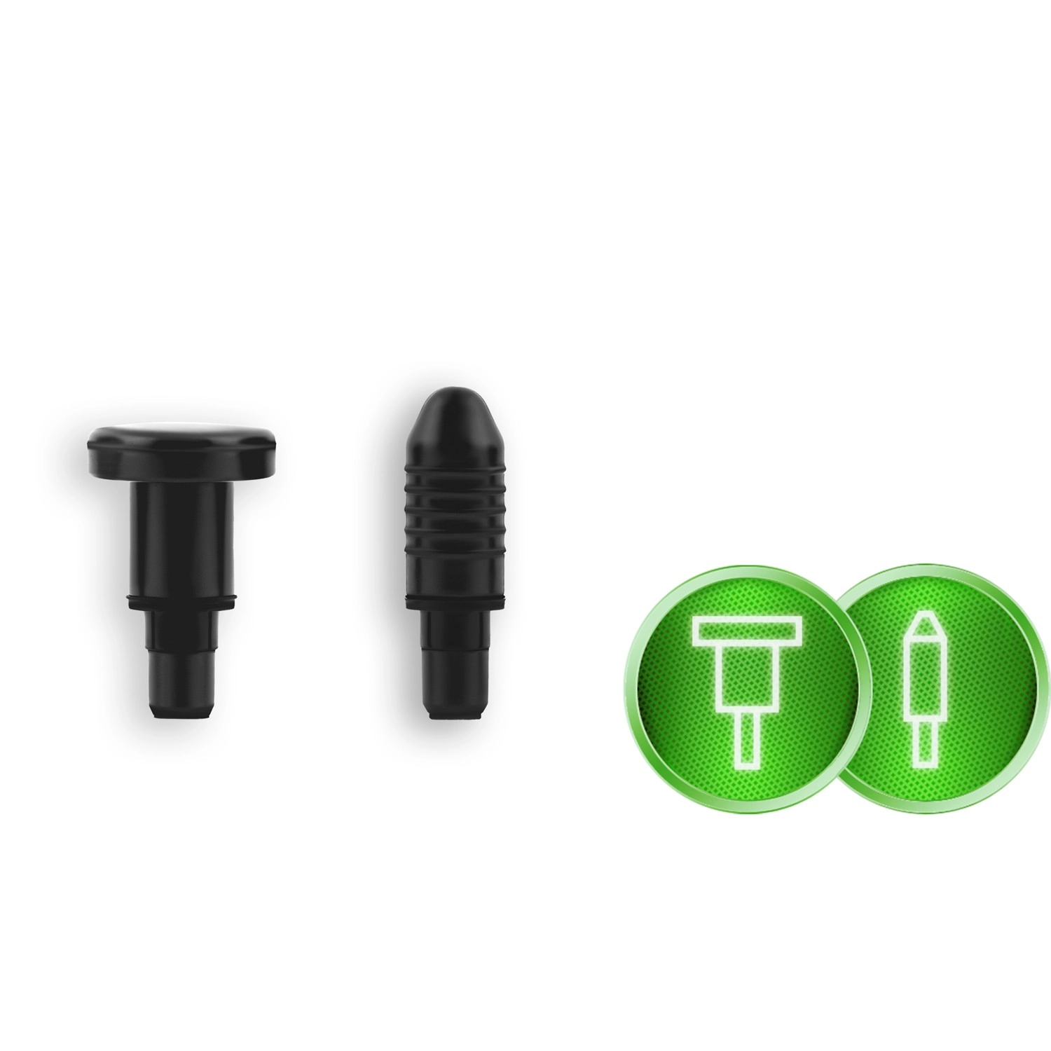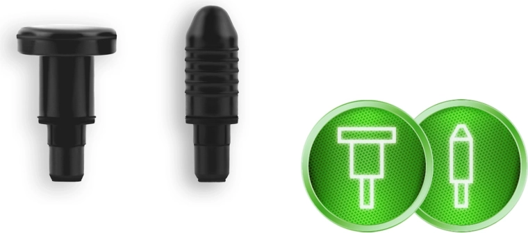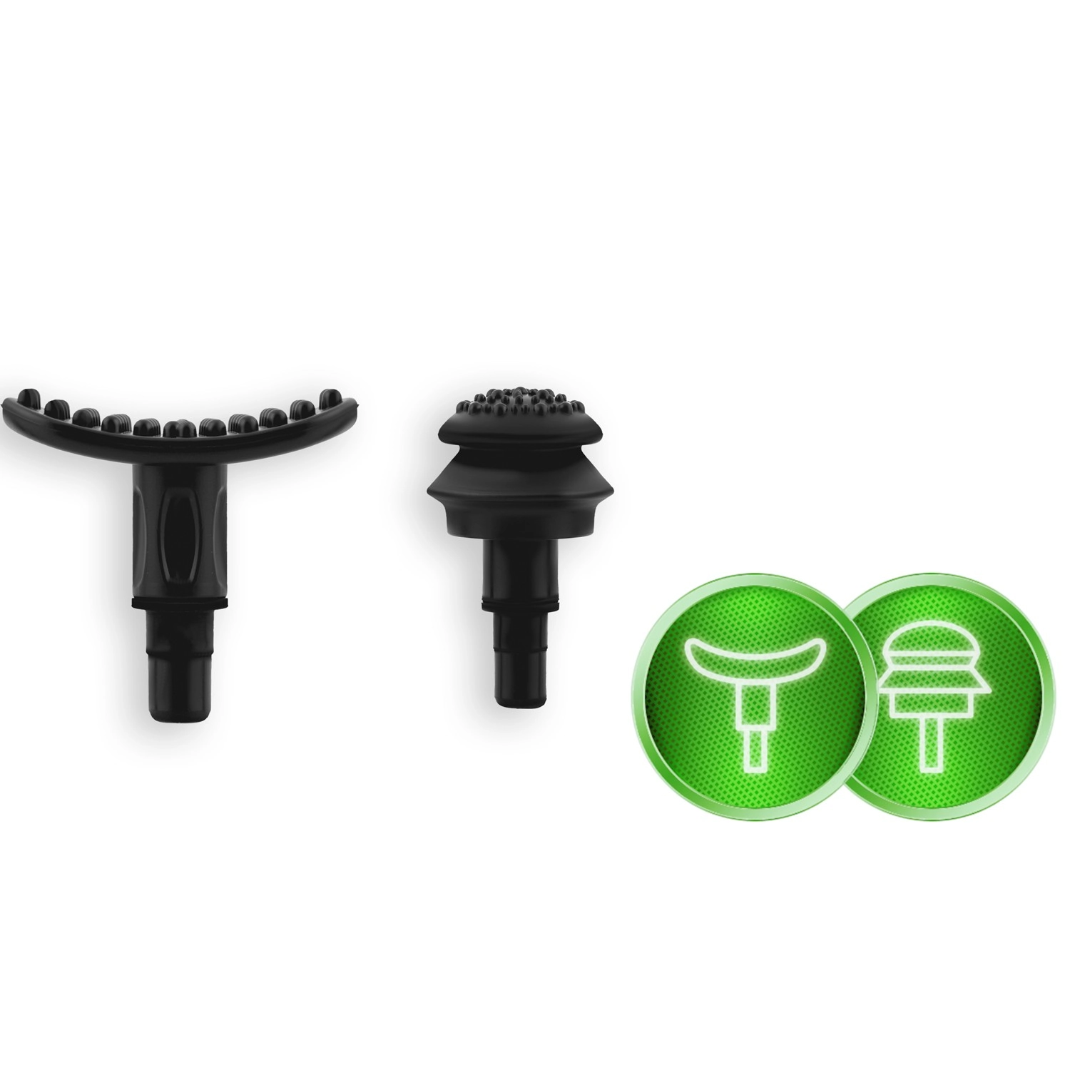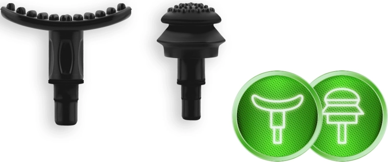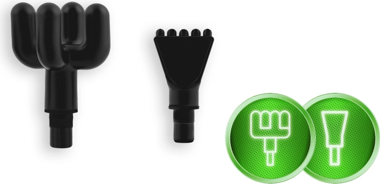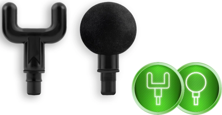 Kompletní sada nástavců pro různé partie: koule pro velké svaly, vidlice na oblast kolem páteře a šlach, plochá hlavice pro hutné tkáně, "pocisk" pro bodový trigger point, čtyřramenná a dvojité U, špachtle na šíji a ramena, banán a jemný „hříbek“ pro nejcitlivější místa.