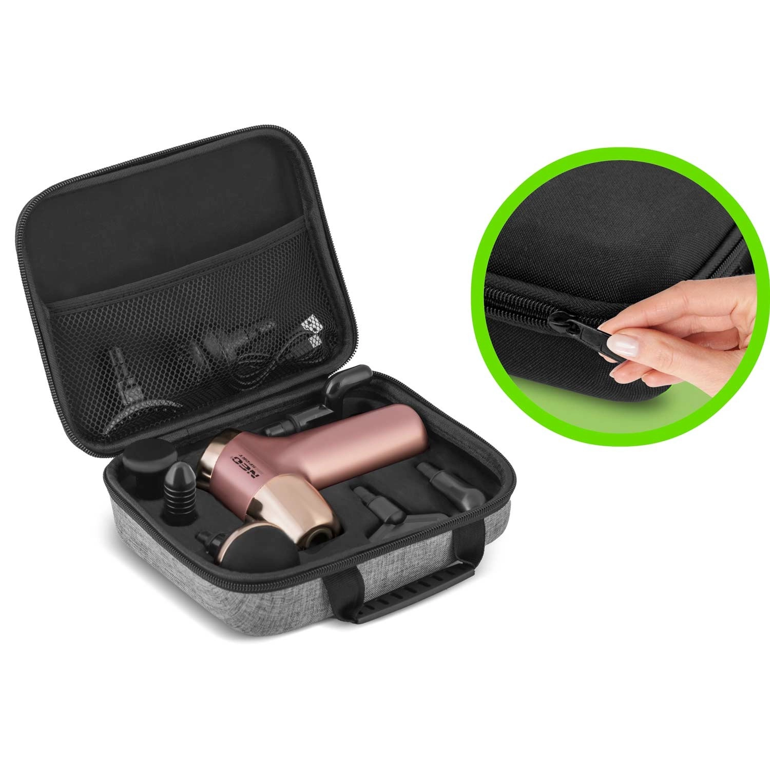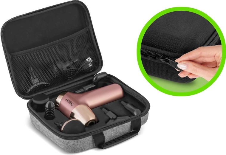 Součástí balení je 8 specializovaných nástavců pro různé svalové partie, elegantní textilní cestovní pouzdro a nabíjecí kabel USB‑C. LCD displej umožní snadno sledovat rychlost a stav baterie. Bezpečnostní systém chrání motor před přetížením a automaticky vypne zařízení při příliš silném tlaku.