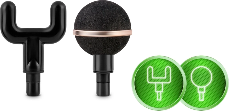 Vidlička pro oblast páteře a Achillovky, kulová pro velké svaly, plochá pro zhuštěné tkáně, projektil pro bodový tlak a další speciální nástavce.