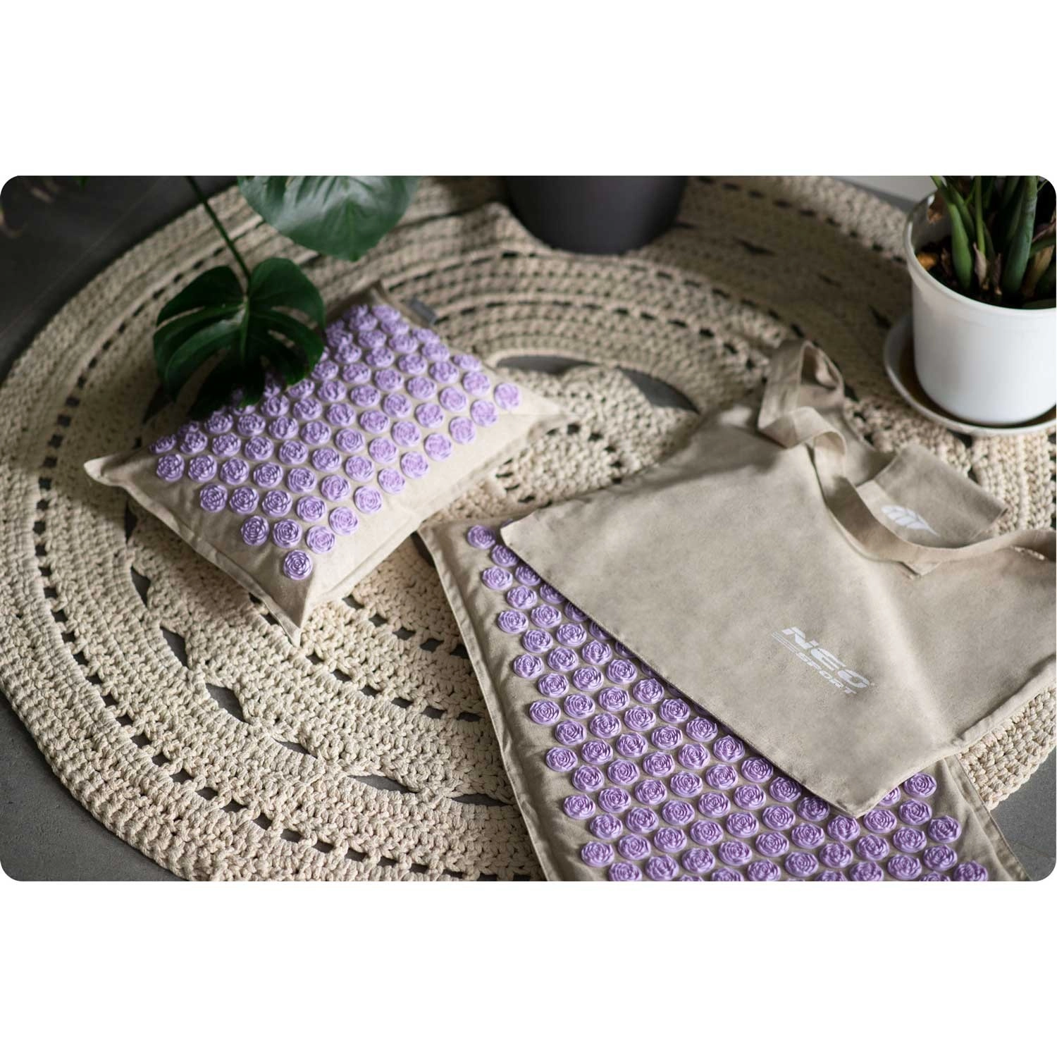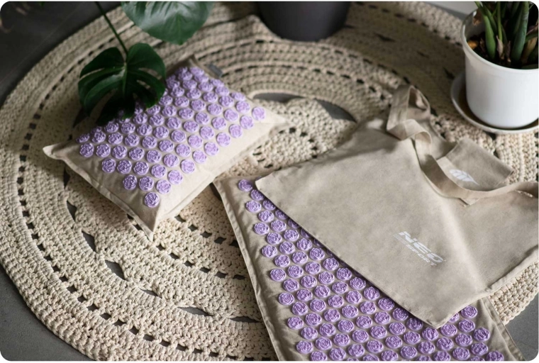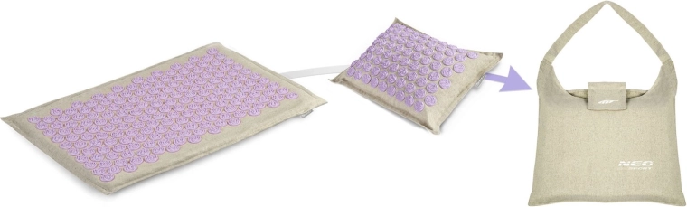 Objevte relaxaci a úlevu od napětí s akupresurní sadou NEO-SPORT – podložkou a polštářkem se levandulovými lotosovými disky. Díky 181 výstupkům na podložce a 76 na polštářku podporuje prokrvení, uvolnění zad, šíje a hlavy a pomáhá zmírnit stres. Přírodní kokosové vlákno uvnitř, snadno snímatelný potah a stylová taška pro pohodlné přenášení.