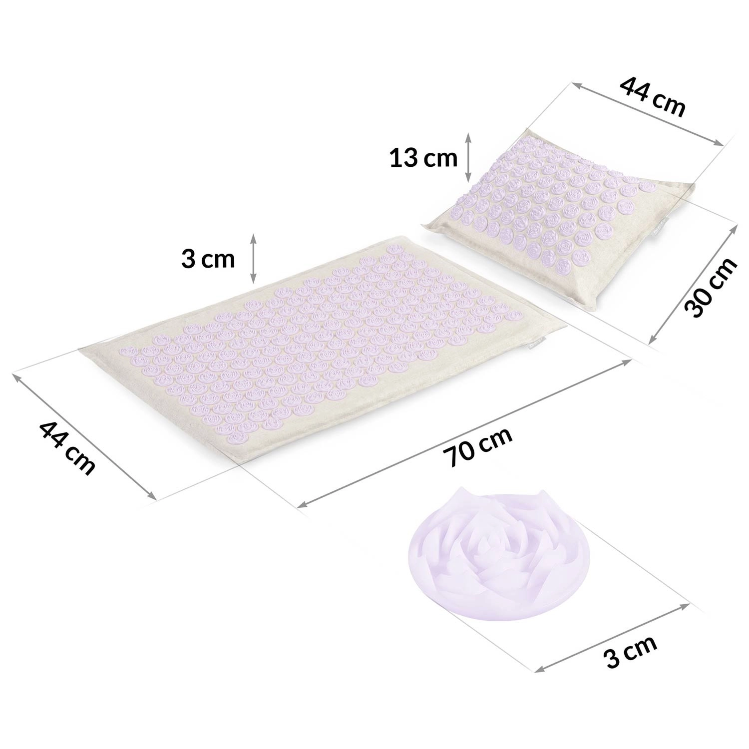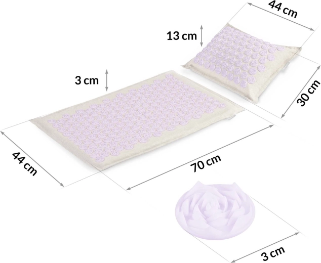 - Intenzivní akupresura: 181 disků na podložce + 76 na polštářku pro cílené působení na záda, šíji a hlavu.