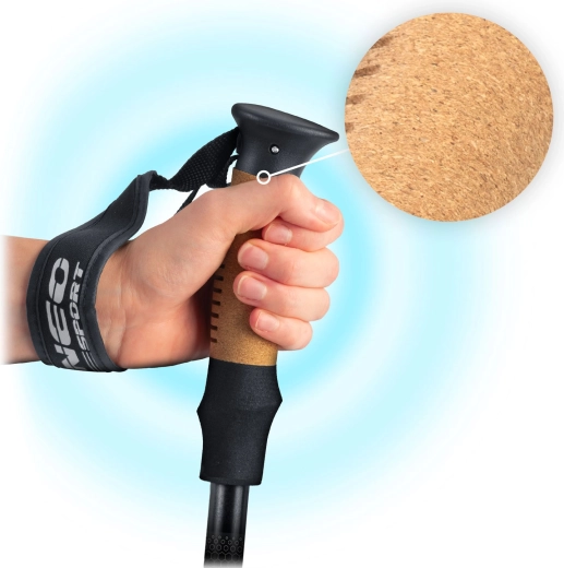 Ergonomická rukojeť z přírodního korku zůstává příjemná na dotek v horku i chladu, odvádí vlhkost a spolu s měkkým nastavitelným poutkem snižuje únavu rukou při dlouhých túrách.