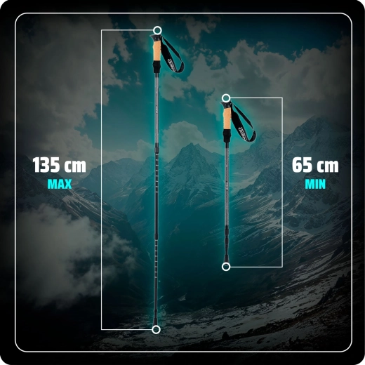- Teleskopická regulace 65–135 cm – rychlé nastavení pro každý terén