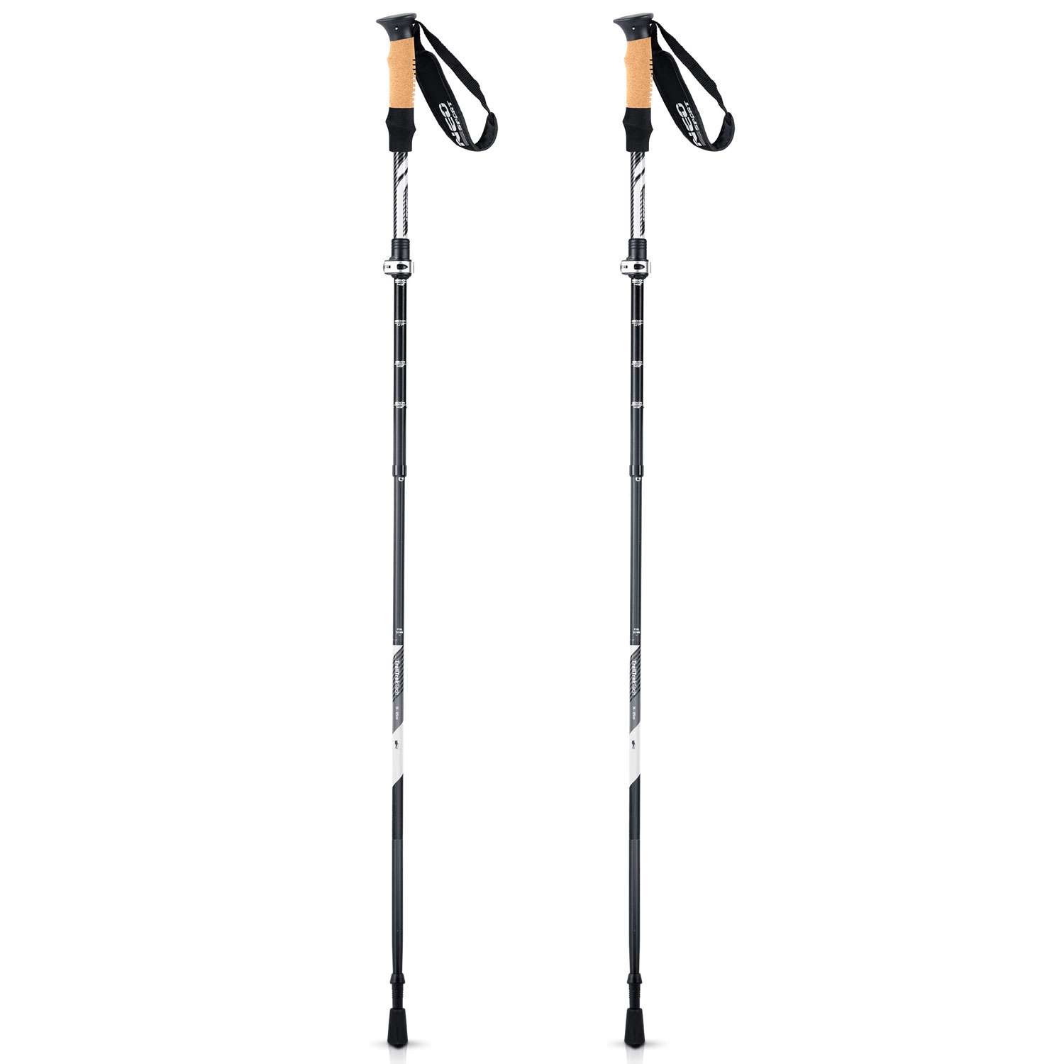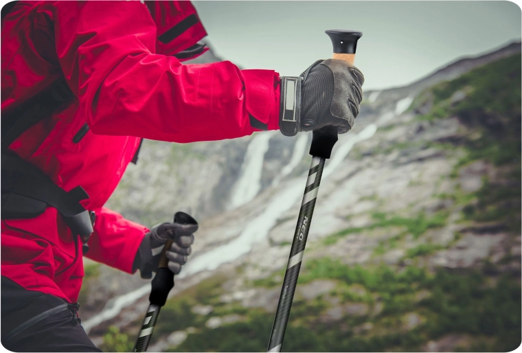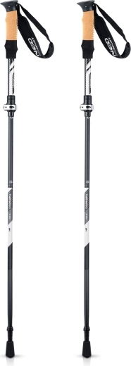 Konstrukce z hliníkové slitiny AL 7075 kombinuje velmi nízkou hmotnost (pouze cca 355 g na hůl) s vysokou tuhostí a odolností proti korozi. Korková rukojeť dýchá, skvěle sedí v ruce a spolu s měkkým nastavitelným poutkem omezuje únavu dlaní i otlaky během celodenní chůze.