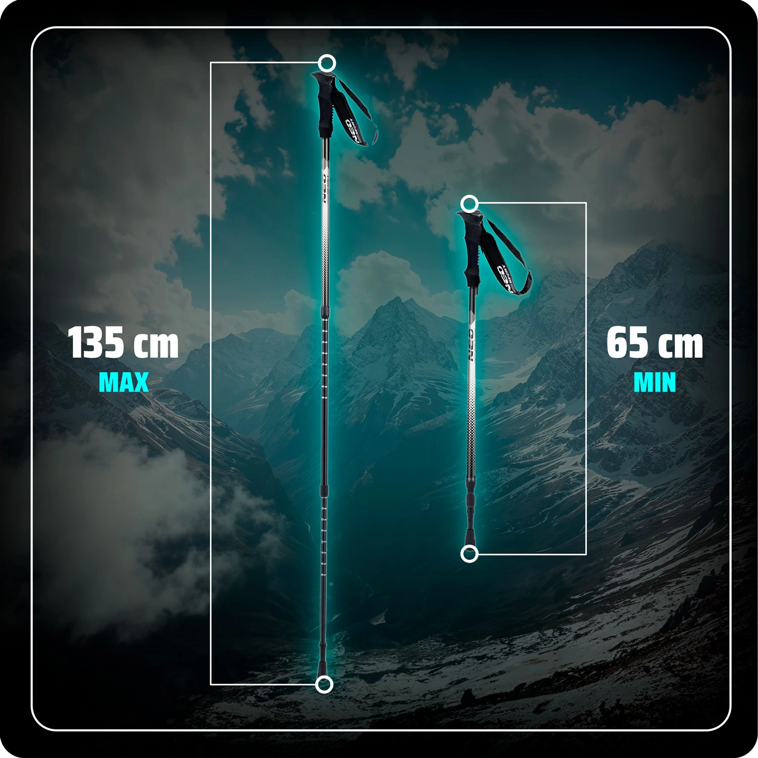 - Teleskopické nastavení 65–135 cm – rychlé přizpůsobení terénu i postavě