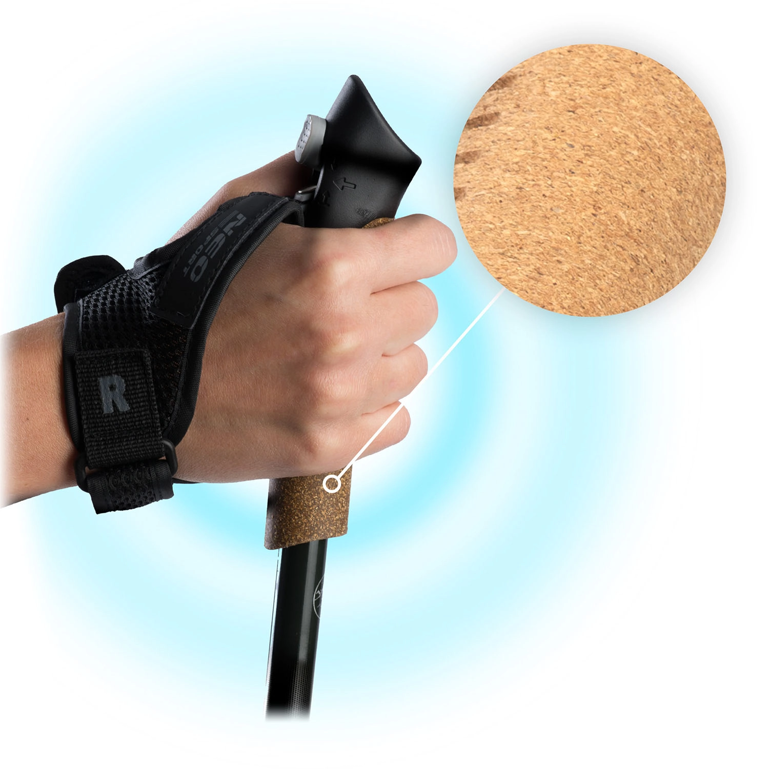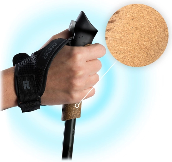 Prodyšný korek udrží dlaně v suchu a pohodlí. Nastavitelné rukavičky se snadno odepínají jedním tlačítkem – pevný úchop bez únavy prstů i při dlouhých túrách.