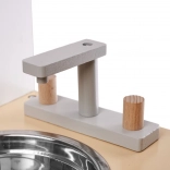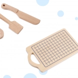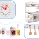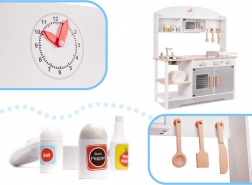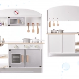 Stylová dřevěná dětská kuchyňka z MDF v neutrálních barvách přináší hodiny kreativní hry. Má kovový vyjímatelný dřez, plotýnky s otočnými knoflíky, troubu s okénkem a displejem, mikrovlnku i odkapávač na nádobí. Součástí je bohaté příslušenství ze dřeva (hrnec, pánev, talířky, nožík, lžíce, obracečka, kořenky) a praktické háčky a police pro uložení. Bezpečné, hladce broušené a natřené netoxickými barvami.