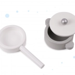 Hrnec a pánev s pokličkou, talířky, krájecí prkénko a náčiní i kořenky – vše sladěné a připravené k servírování imaginárních dobrot.