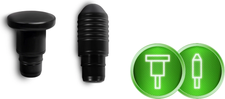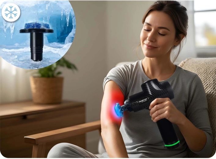 - Chladicí gelová hlavice: po předchozím zchlazení uklidňuje podráždění, zmírňuje otoky a záněty – ideální po přetížení či intenzivním výkonu.