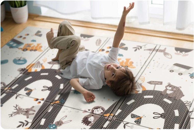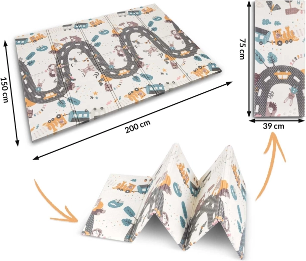Praktická a stylová dětská podložka z kvalitní pěny XPE o rozměrech 200 × 150 × 1 cm přináší měkké a bezpečné prostředí pro hraní, lezení i první krůčky. Je oboustranná (vzdělávací kontrastní strana a hrací silnice se zvířátky), skládací, lehká, voděodolná a snadno se čistí. Díky protiskluzové textuře, tepelně izolační ochraně od podlahy a složení bez BPA, PVC, ftalátů a formamidu splňuje přísné evropské normy a poskytuje dětem prémiové pohodlí i bezpečí.