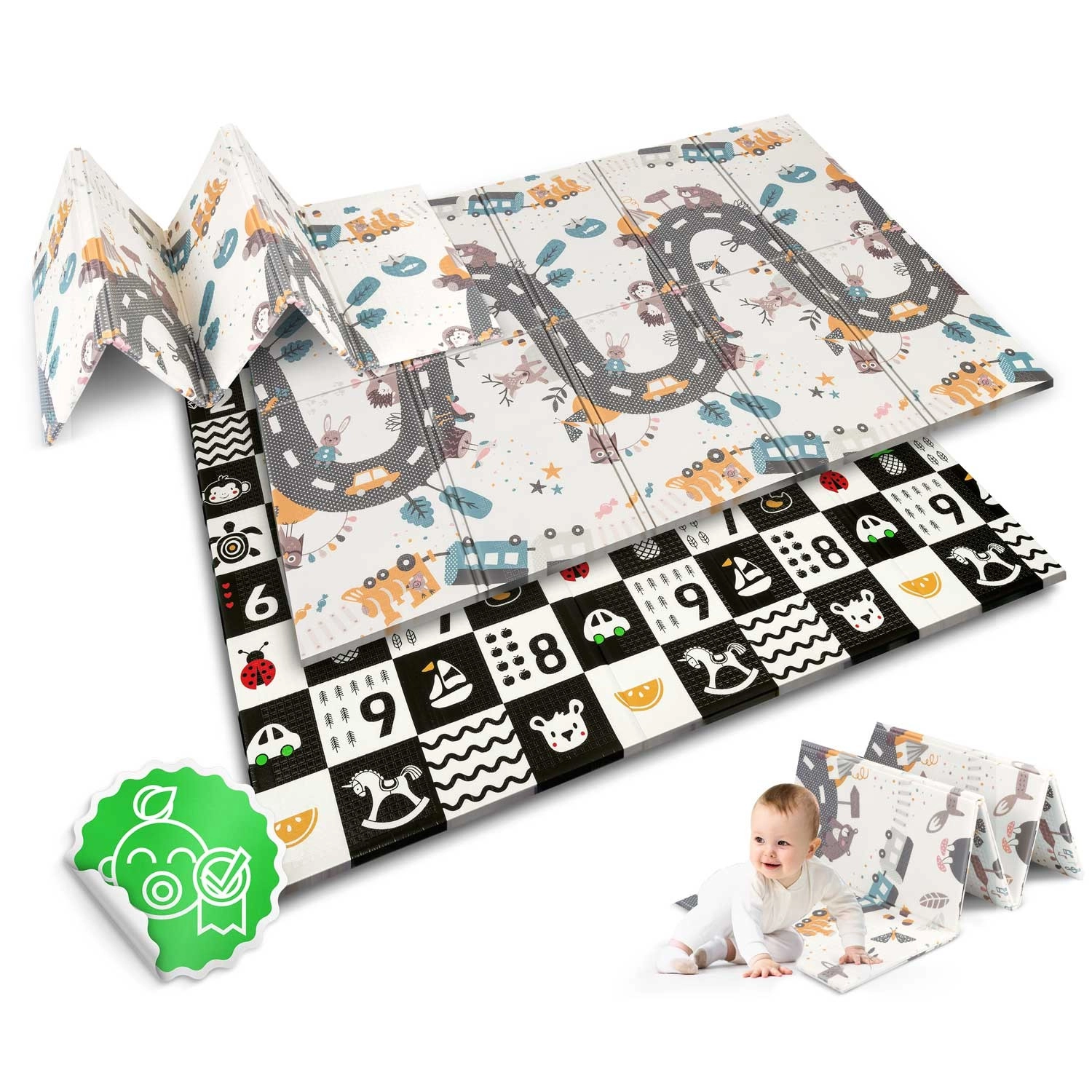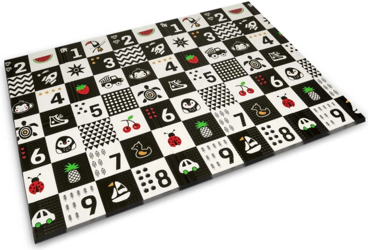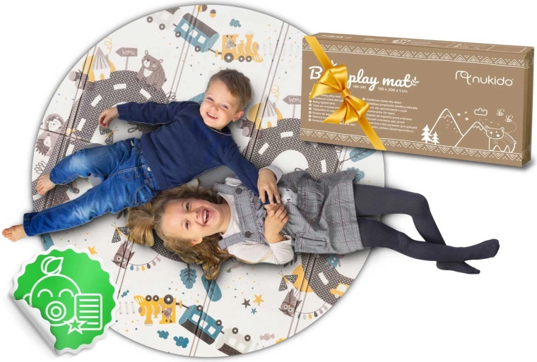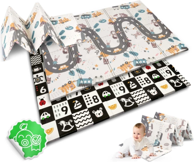 Tato velká skládací pěnová podložka NUKIDO vyniká tloušťkou 1 cm pro spolehlivé tlumení pádů na tvrdé podlaze a tepelnou izolaci od studených dlaždic či panelů. Oboustranný potisk rozvíjí smysly i fantazii: jedna strana nabízí vysoký kontrast s čísly a ikonami pro rané učení, druhá pak silniční motiv pro hraní s autíčky a příběhy.