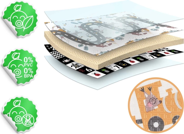 - Bezpečný materiál XPE – bez BPA, PVC, ftalátů a formamidu, splňuje CE a EN71-1/2/3.