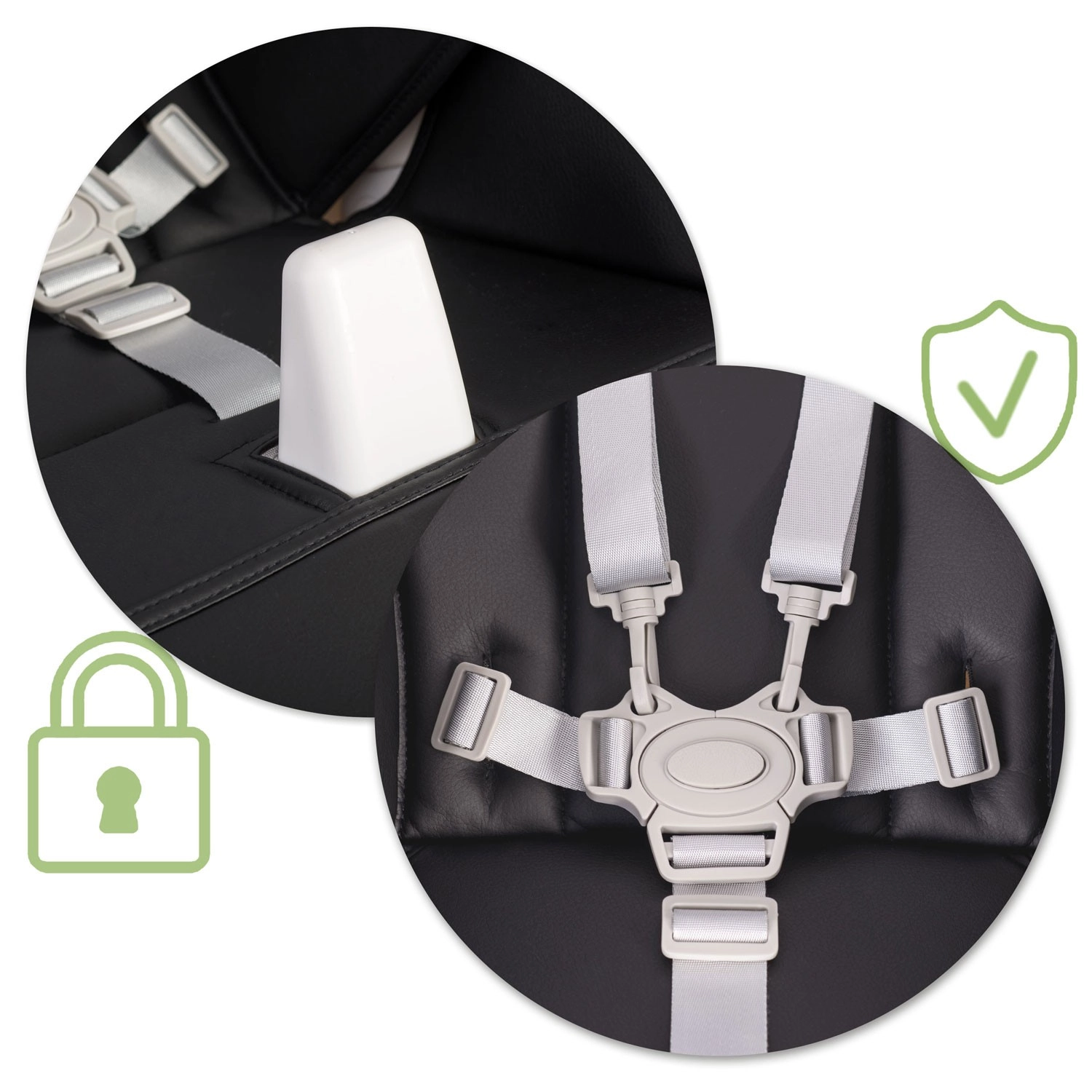 Nastavitelné 5bodové pásy a středový mezinožní popruh pevně drží dítě v bezpečné poloze a brání samovolnému vysunutí ze židličky.