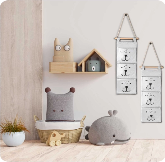 Praktický závěsný organizér Nukido se třemi prostornými kapsami v šedé barvě pomůže udržet pořádek v dětském pokoji. Je vyroben z kvalitní bavlny, zavěsí se jednoduše na dřevěnou tyčku a provaz. Díky veselým motivům zvířátek a kompaktnímu vertikálnímu tvaru šetří místo a zároveň zútulní interiér. Tři kapsy, odolný textil a snadná montáž na zeď z něj dělají ideální volbu pro hračky, doplňky i drobnosti.