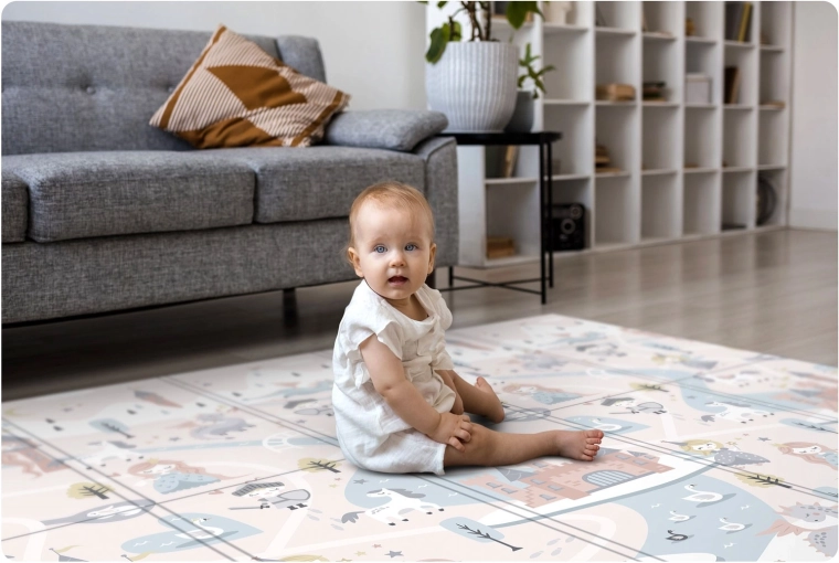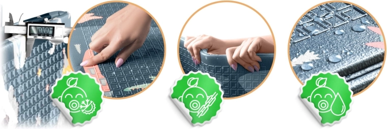 Tloušťka 1 cm z kvalitní pěny XPE zajišťuje měkký došlap, tlumení pádů a příjemné teplo od země. Ideální na tvrdé povrchy jako dlažba či parkety.
