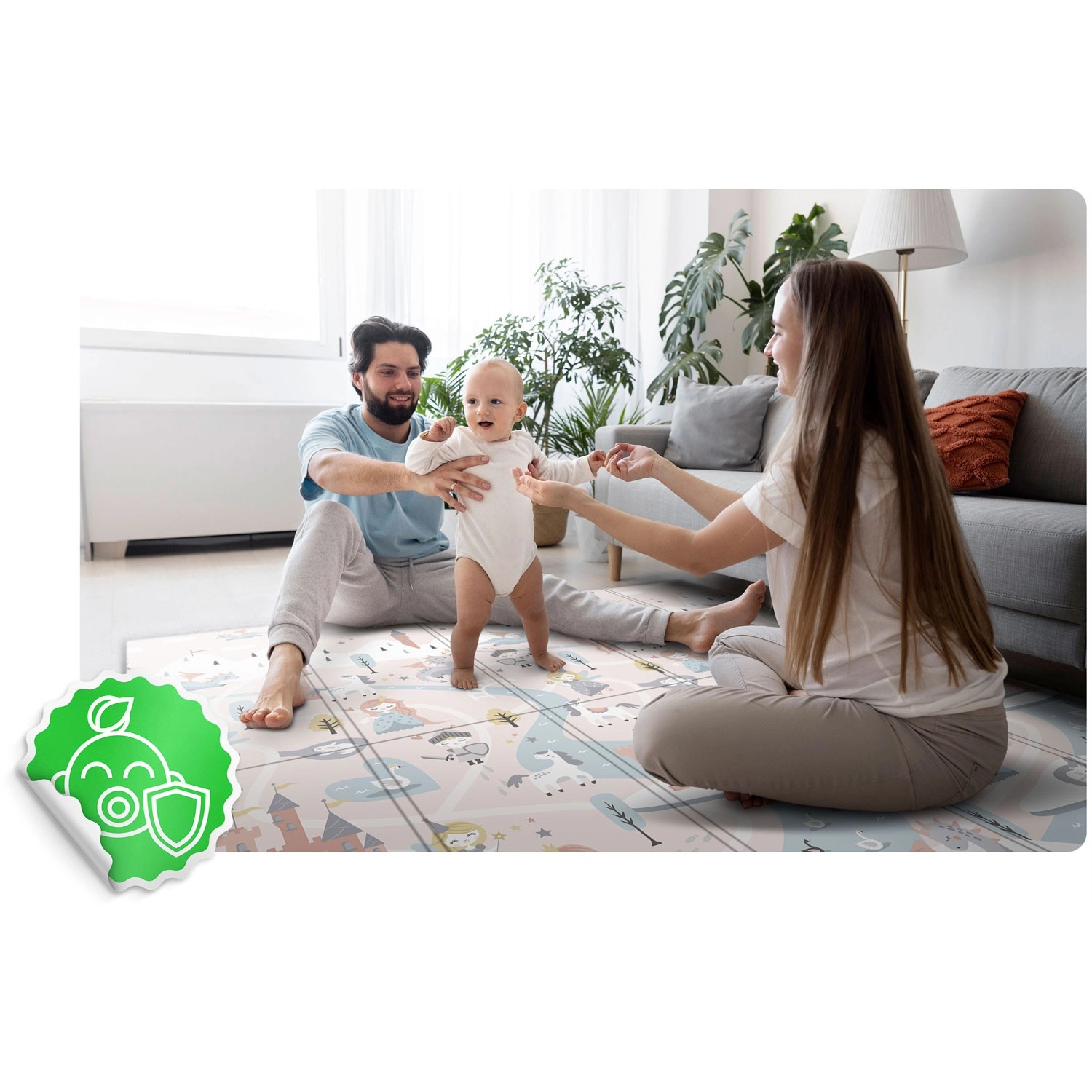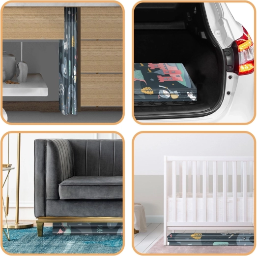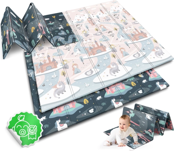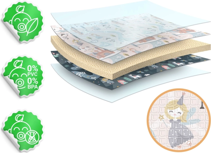 Podložka se rychle skládá na akordeon, snadno se přenáší a uloží pod postel či do auta. Voděodolný povrch stačí otřít vlhkým hadříkem, což oceníte doma, na návštěvě i venku na pikniku. Materiál je bez BPA/PVC/fatalátů/formamidu, splňuje CE a testy EN71-1/2/3, takže se můžete spolehnout na ověřenou kvalitu a bezpečí.