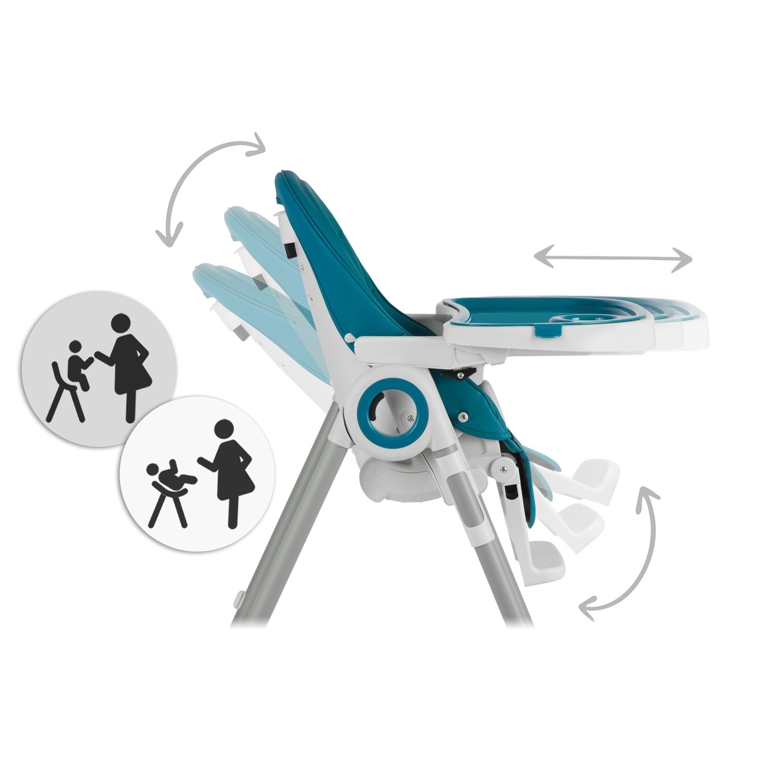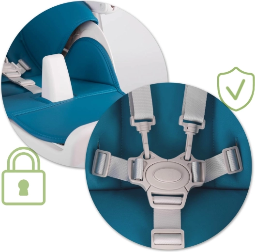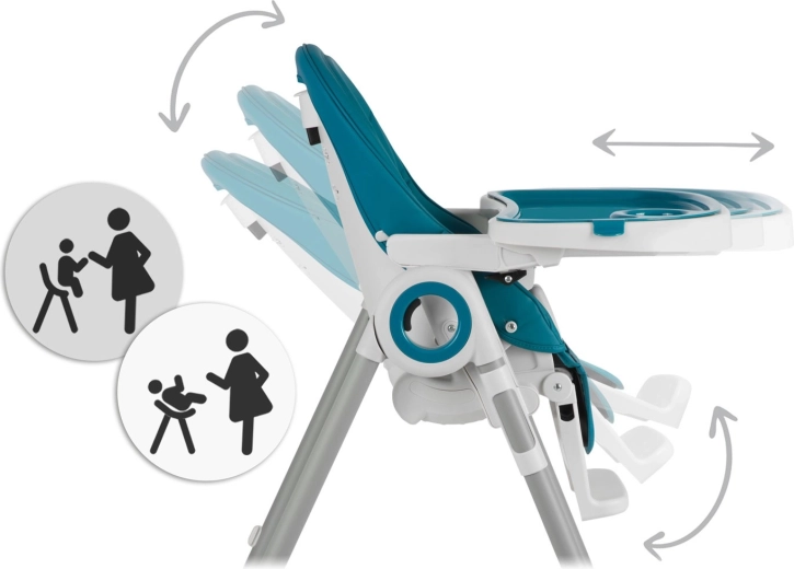 Bezpečí zajišťují 5bodové pásy a stabilní kovová konstrukce s vysokou nosností. Židlička je vhodná od 6 do 36 měsíců (max. 15 kg) a splňuje přísnou normu EN 14988. Díky funkci téměř do lehu ji lze využít i jako lehátko pro nejmenší a snadno ji přizpůsobíte výšce vašeho sezení – u jídelního stolu i na pohovce.