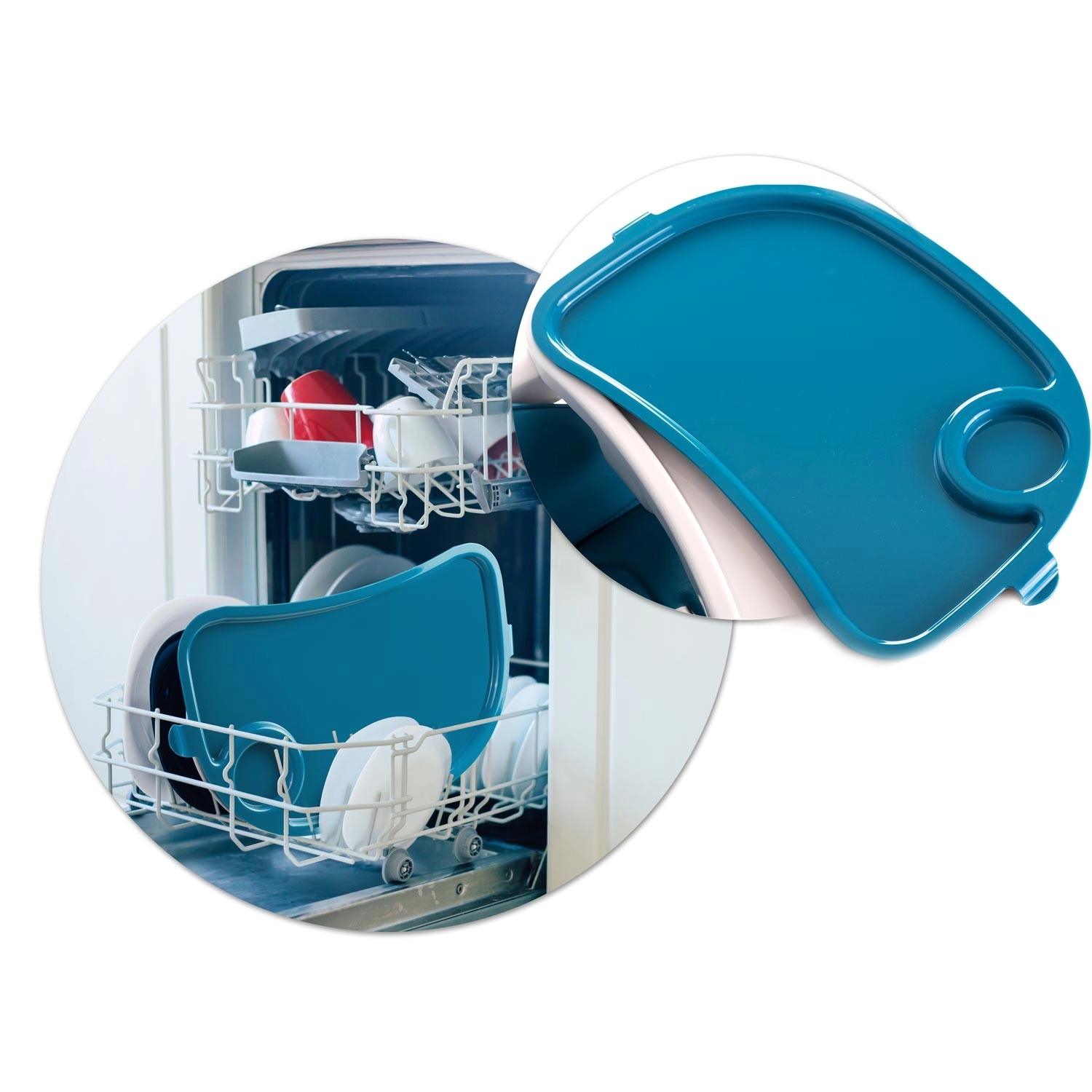 Odnímatelný tác s vložkou s vyvýšenými okraji brání rozlití. Vložku můžete mýt v myčce, celý tác pod tekoucí vodou – úklid je otázkou chvilky.