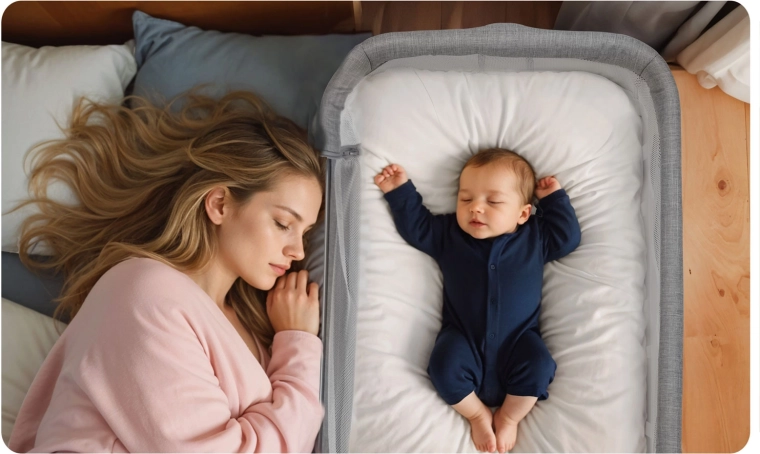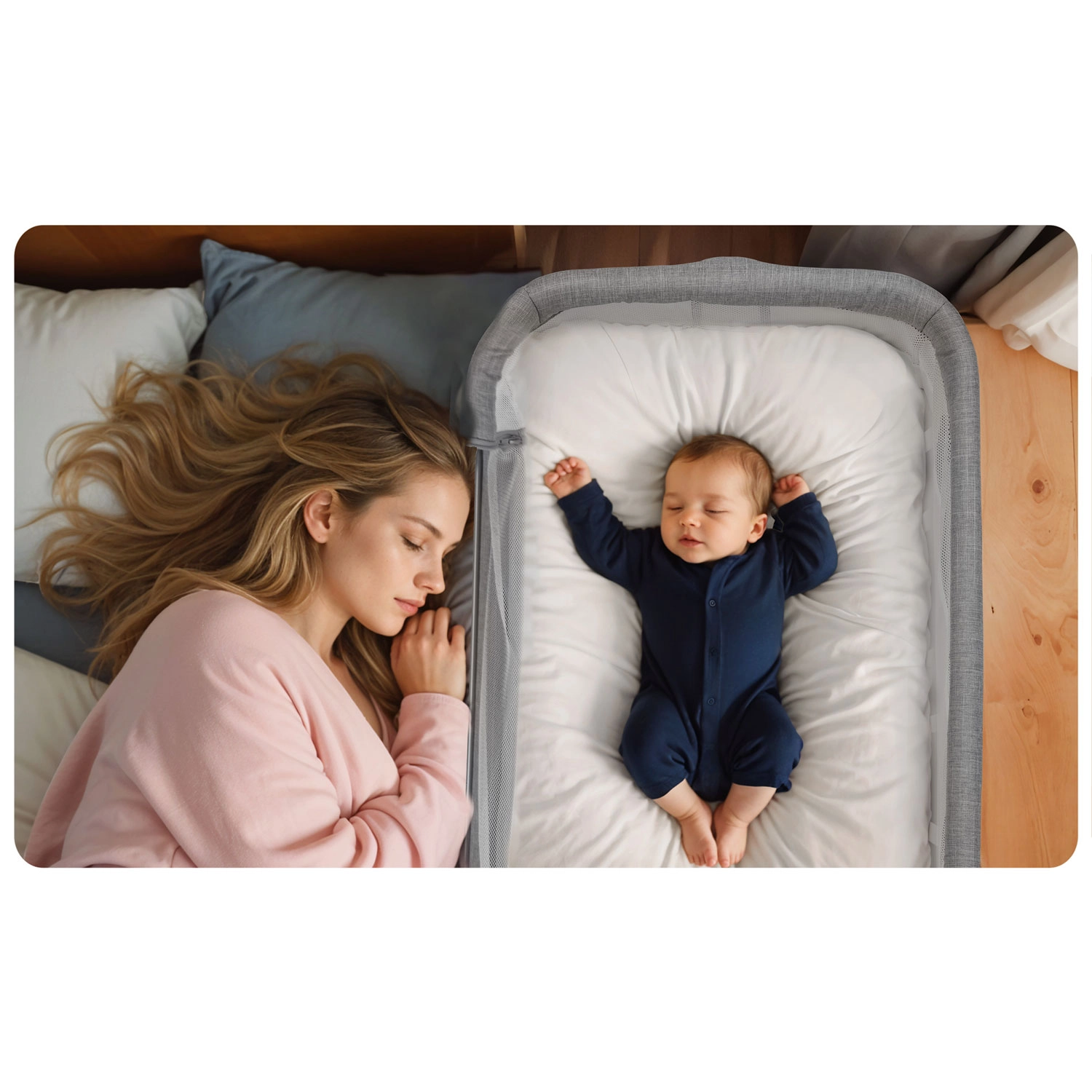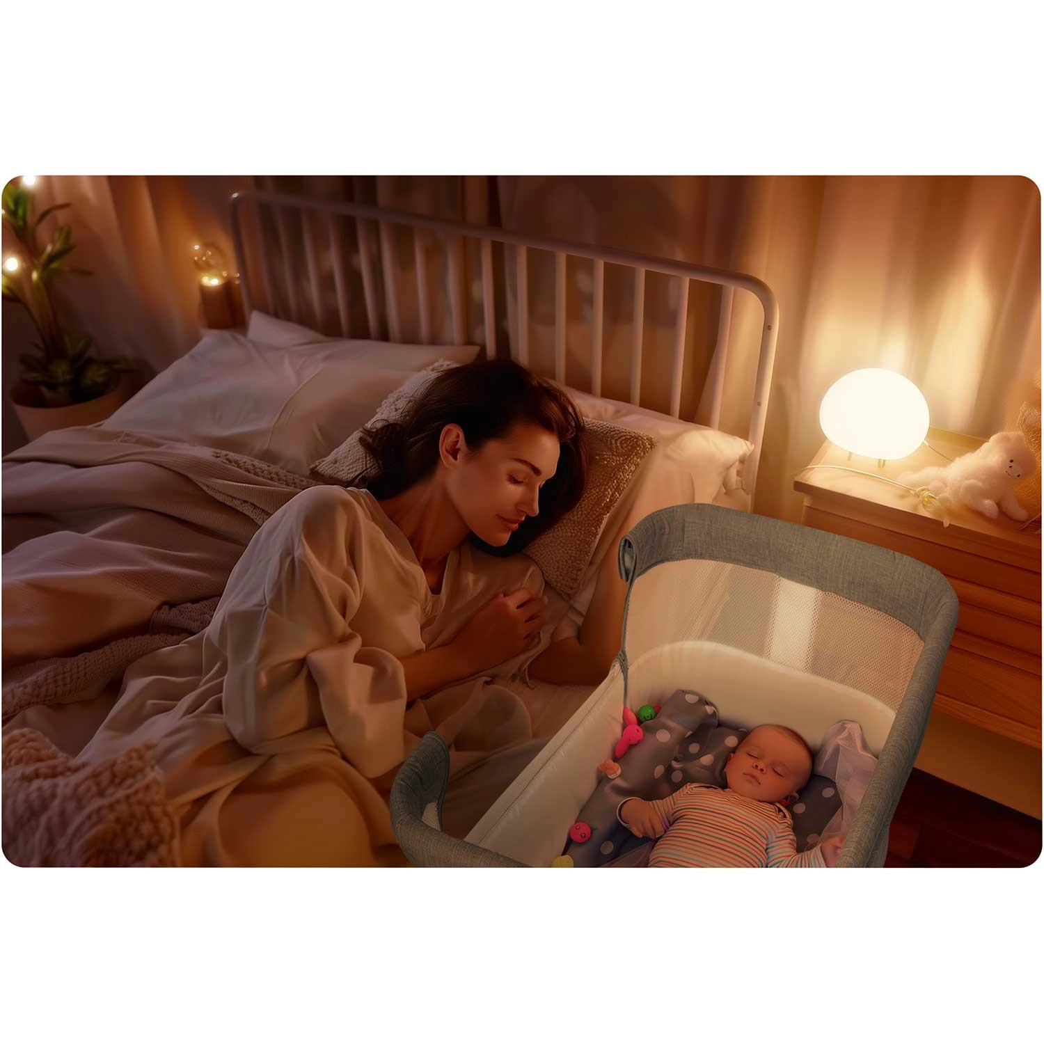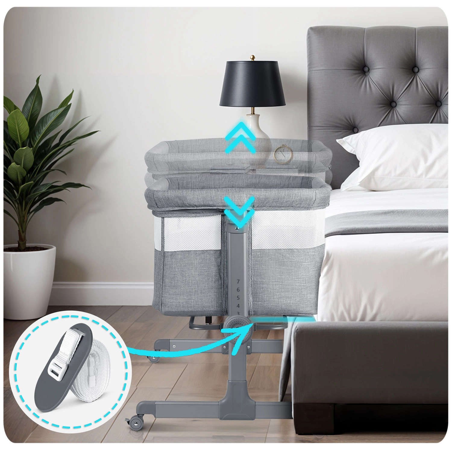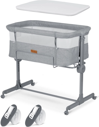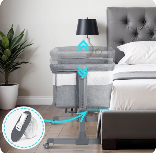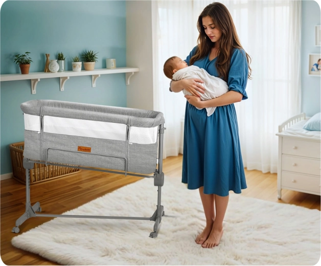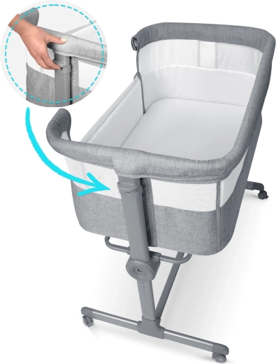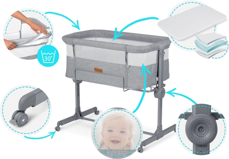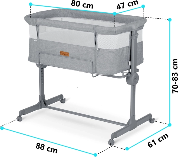 Postýlku snadno přesunete po bytě a bezpečně zafixujete. Stabilní rám a kvalitní aretace zaručují bezpečné používání u lůžka.