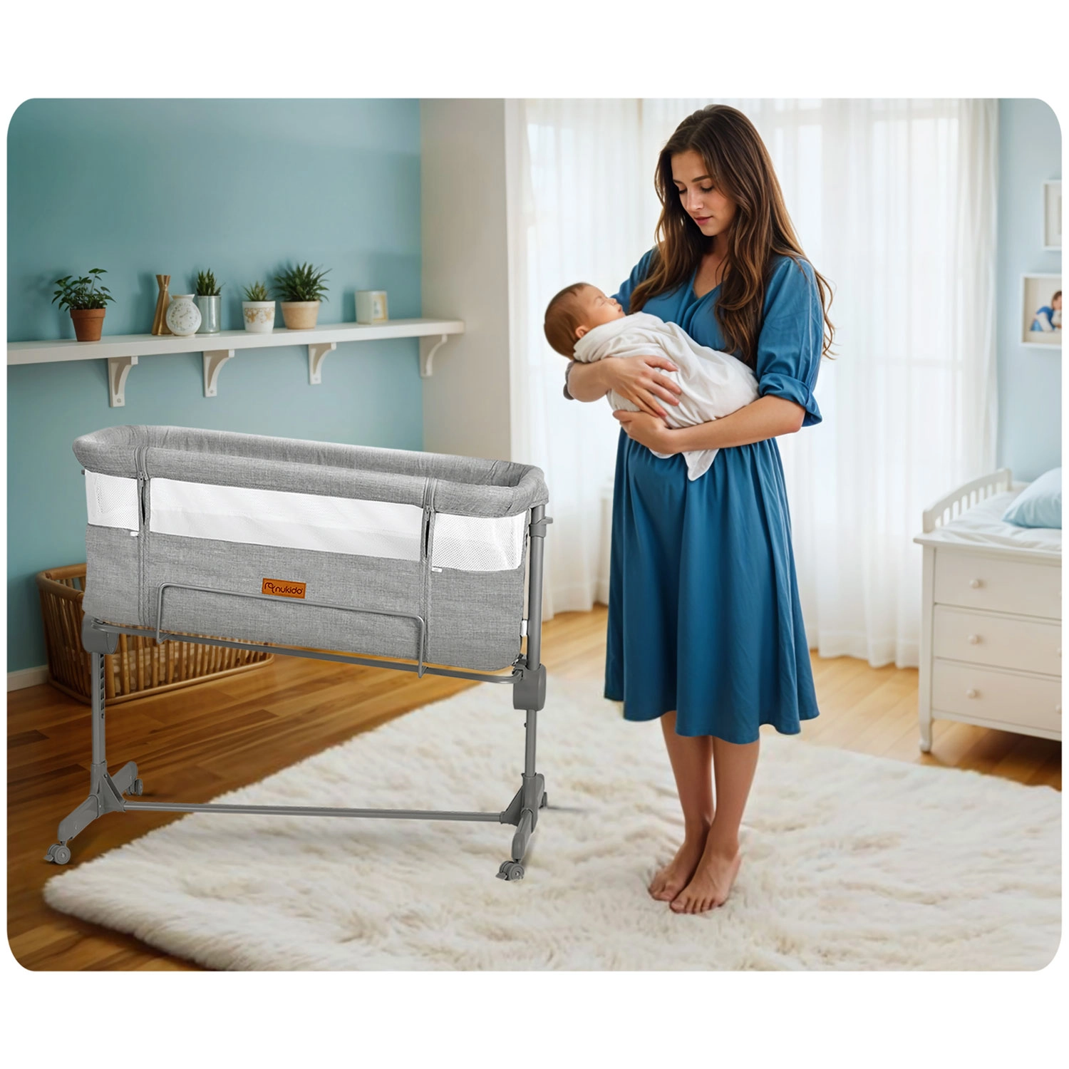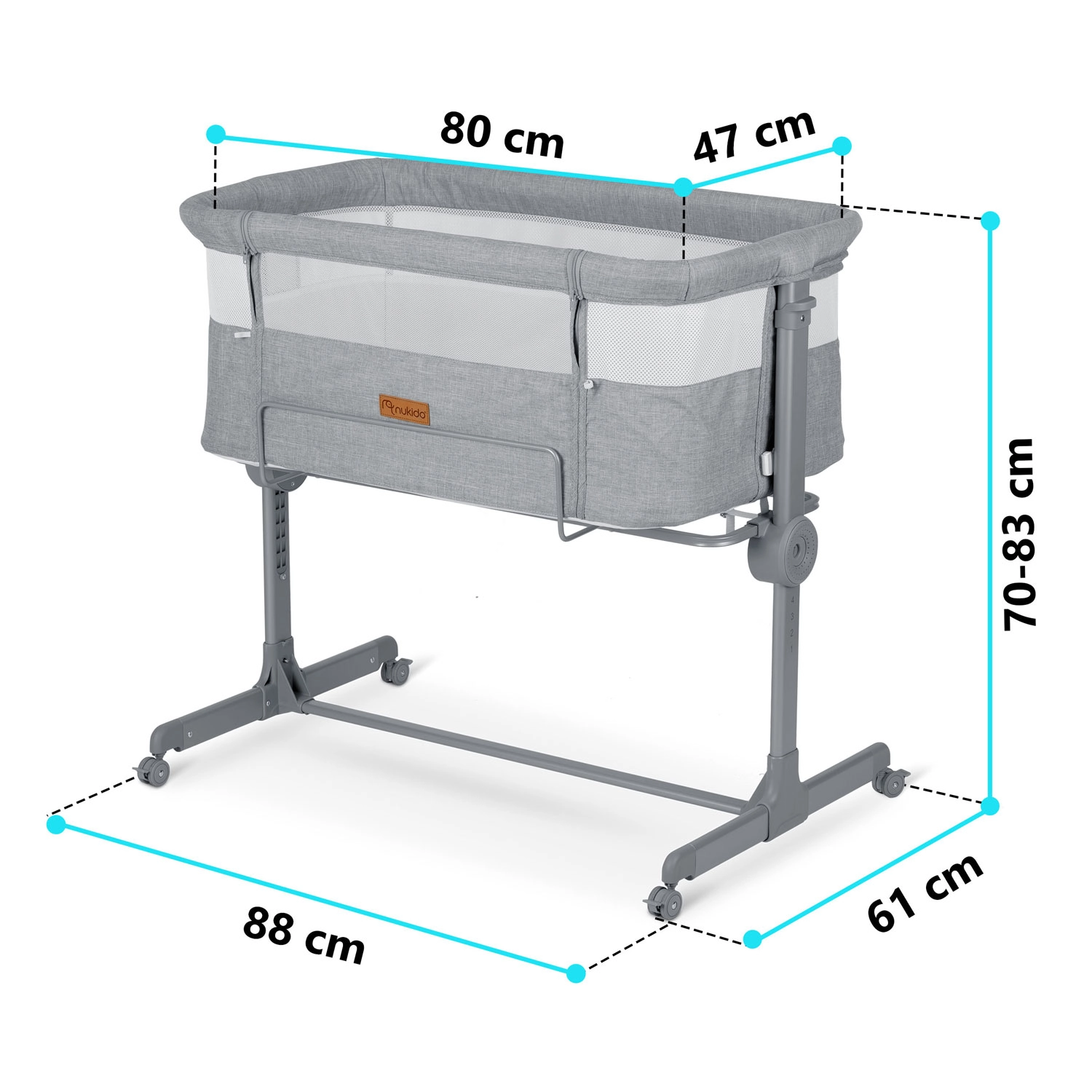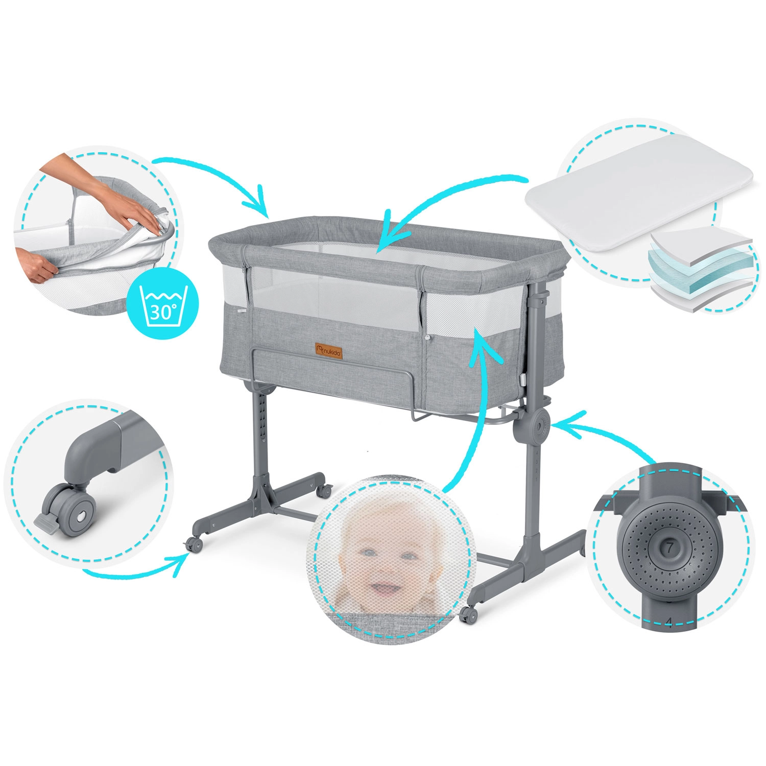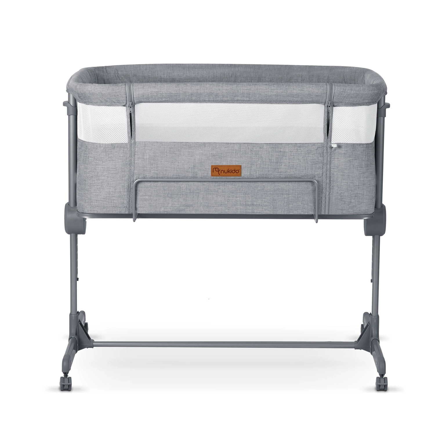 Díky nezávislému nastavení výšky na obou stranách snadno dorovnáte výšku rodičovské postele nebo vytvoříte jemný sklon, který může pomoci dětem s refluxem. Skládací konstrukce, snadno snímatelný a pratelný potah i kolečka s brzdami dělají z NUKIDO praktického pomocníka do menších ložnic i na cesty.