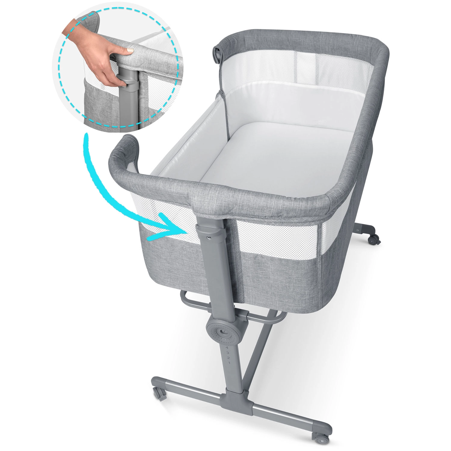Snadno nastavíte výšku každé strany zvlášť. Dorovnáte výšku k posteli rodičů nebo vytvoříte jemný sklon, užitečný například při refluxu.