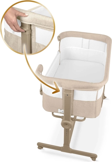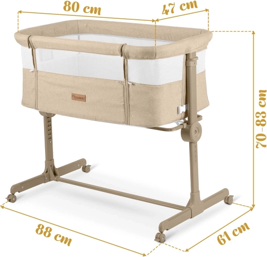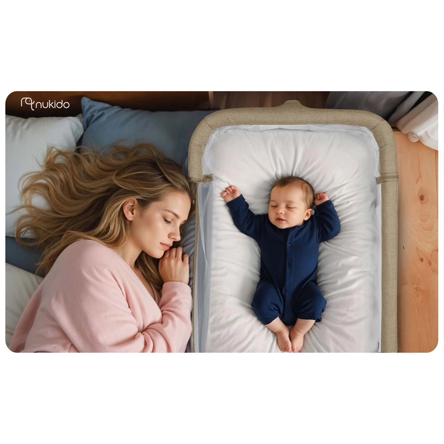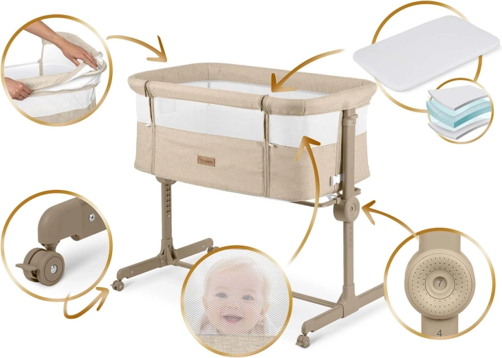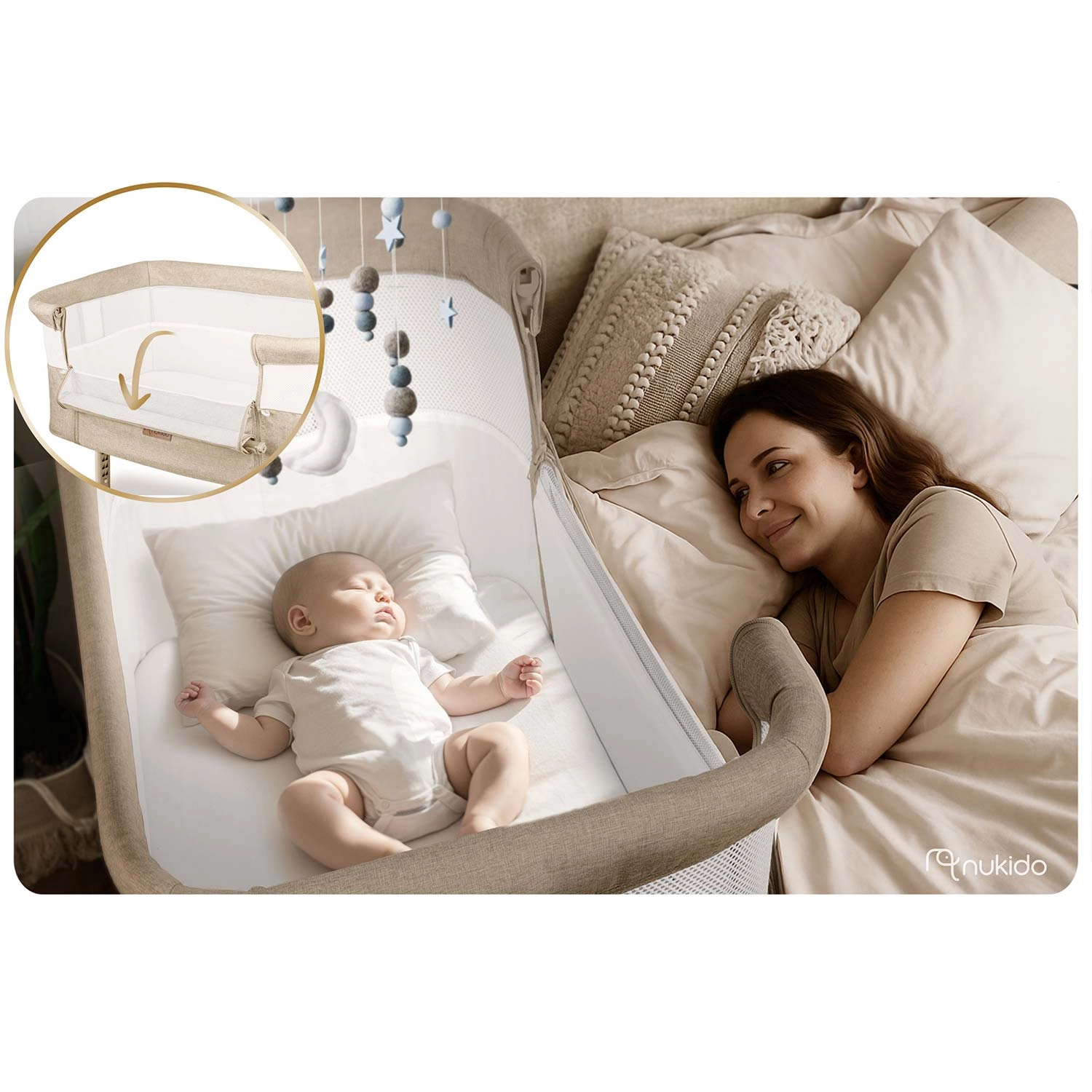 Praktická přístavná postýlka NUKIDO pro novorozence spojuje bezpečné společné spaní s pohodlnou péčí v noci. Nabízí nezávislé nastavení výšky na obou stranách (1–7), prodyšné síťované bočnice, skládací konstrukci a 4 kolečka s brzdami. Součástí je matrace s pratelným potahem a připevňovací pásy pro bezpečné uchycení k posteli rodičů.