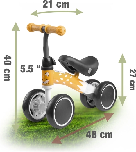 Lehké a stabilní odrážedlo se čtyřmi kolečky pro nejmenší nabízí bezpečnou výuku rovnováhy a zábavu venku i doma. Má odolný kovový rám, měkké pěnové sedátko, gumové rukojeti se zarážkami a váží jen 1,72 kg, takže se snadno přenáší. Jedná se o outletový kus s drobnými vizuálními nedokonalostmi, které neovlivňují funkčnost ani pohodlí jízdy.