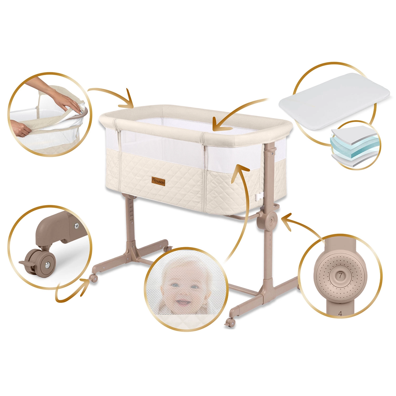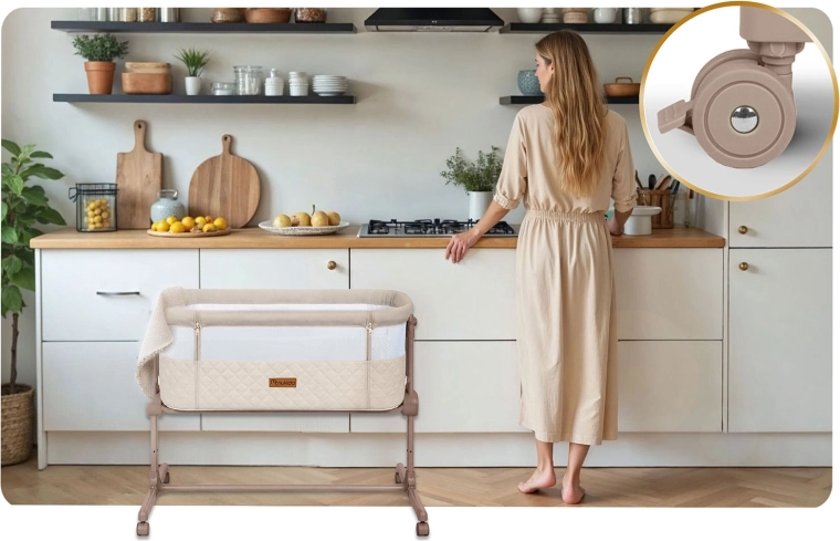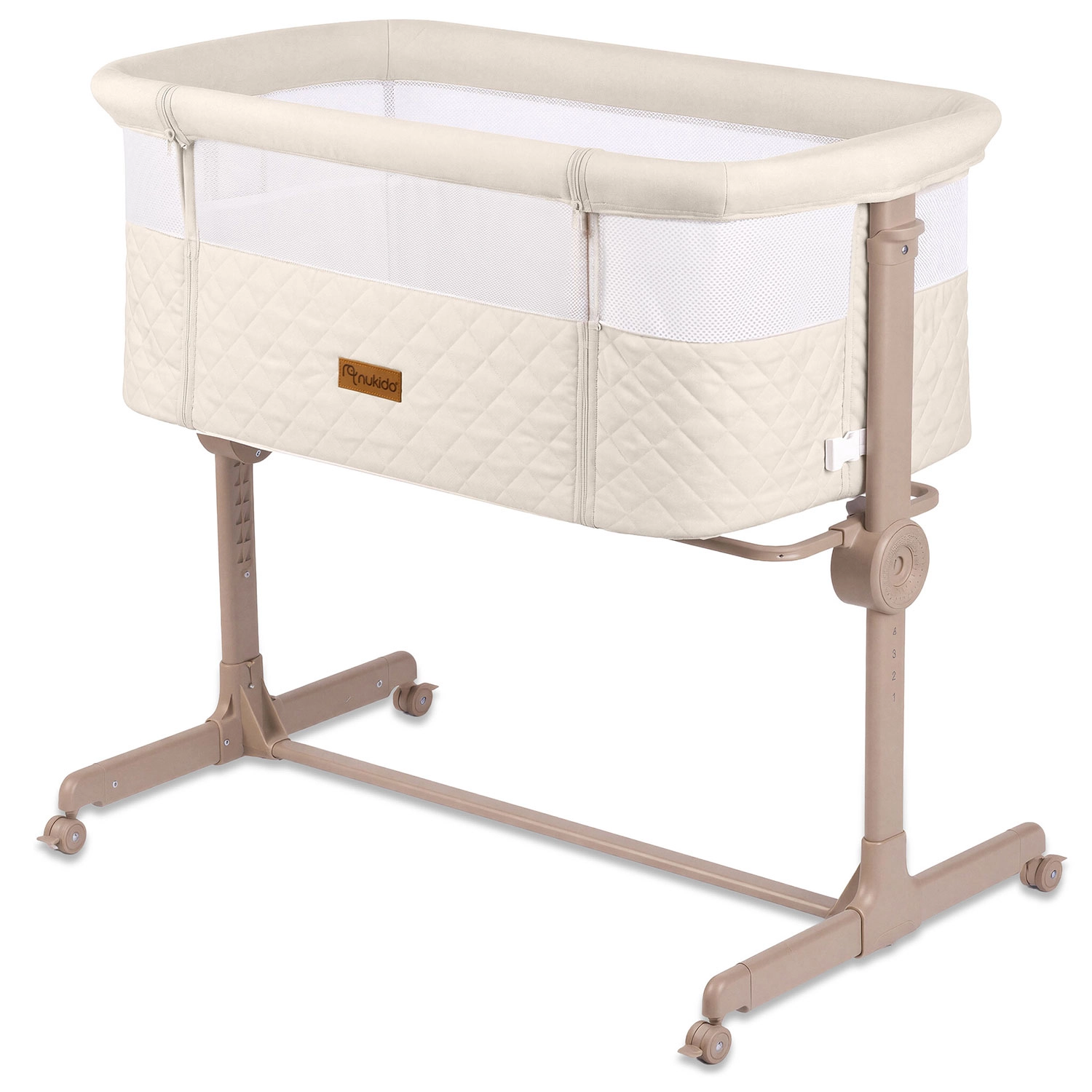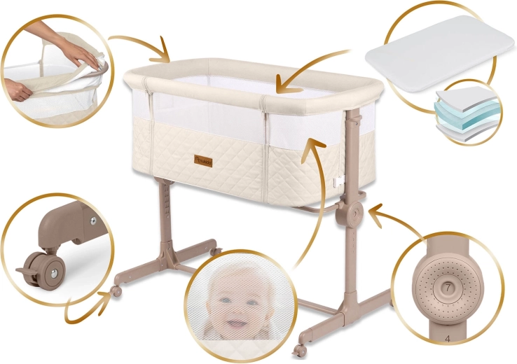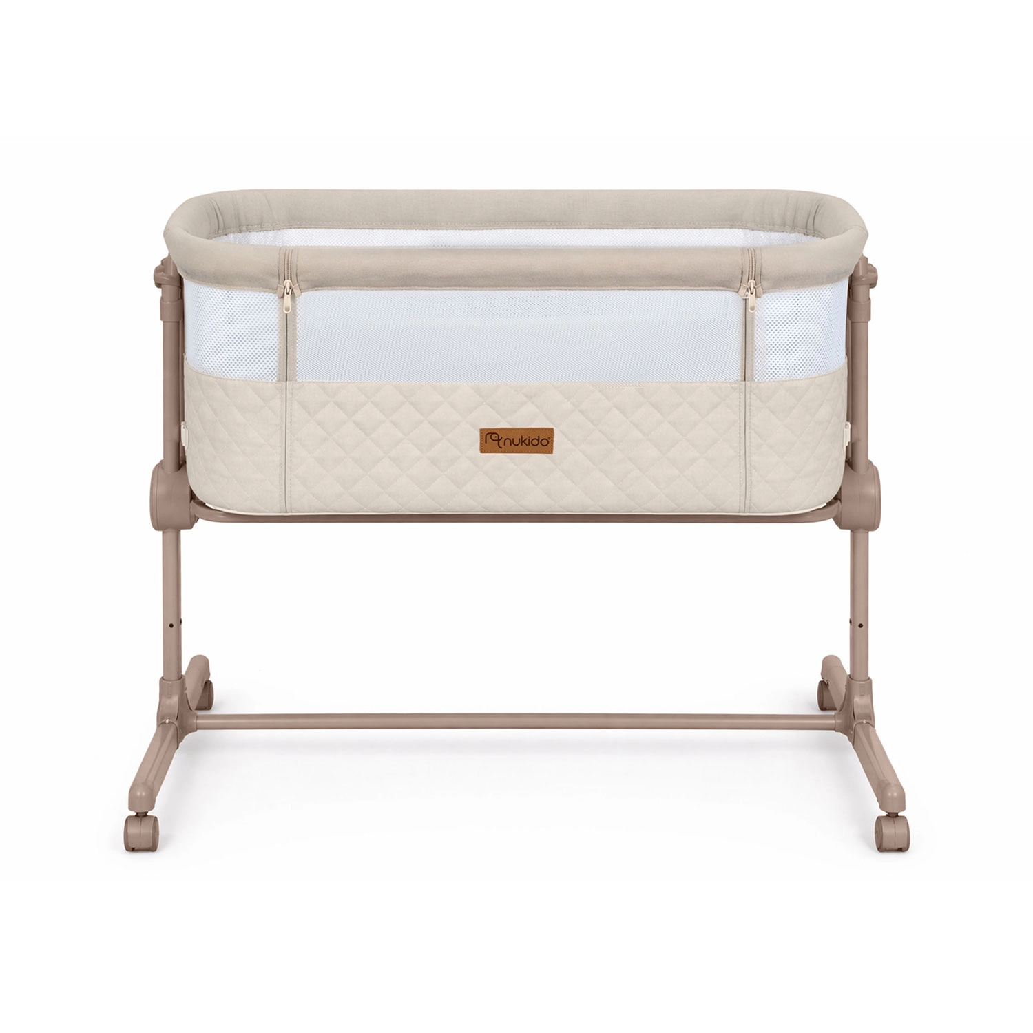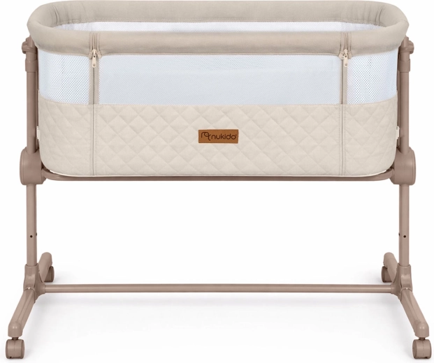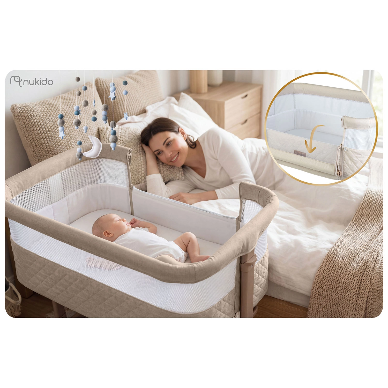 Praktická a bezpečná přístavná postýlka NUKIDO pro novorozence nabízí 7 úrovní výškového nastavení, nezávislé naklopení obou stran pro pohodlí i při refluxu, odnímatelný boční panel na zip pro snadný přístup v noci a 4 kolečka s brzdami pro mobilitu po domě. Součástí je matrac s pratelným potahem a pásy pro bezpečné upevnění k posteli rodičů.