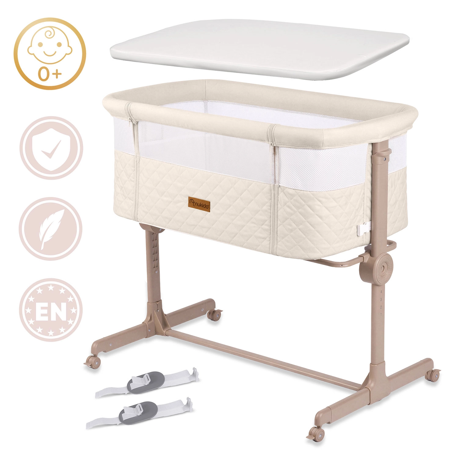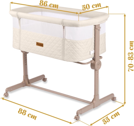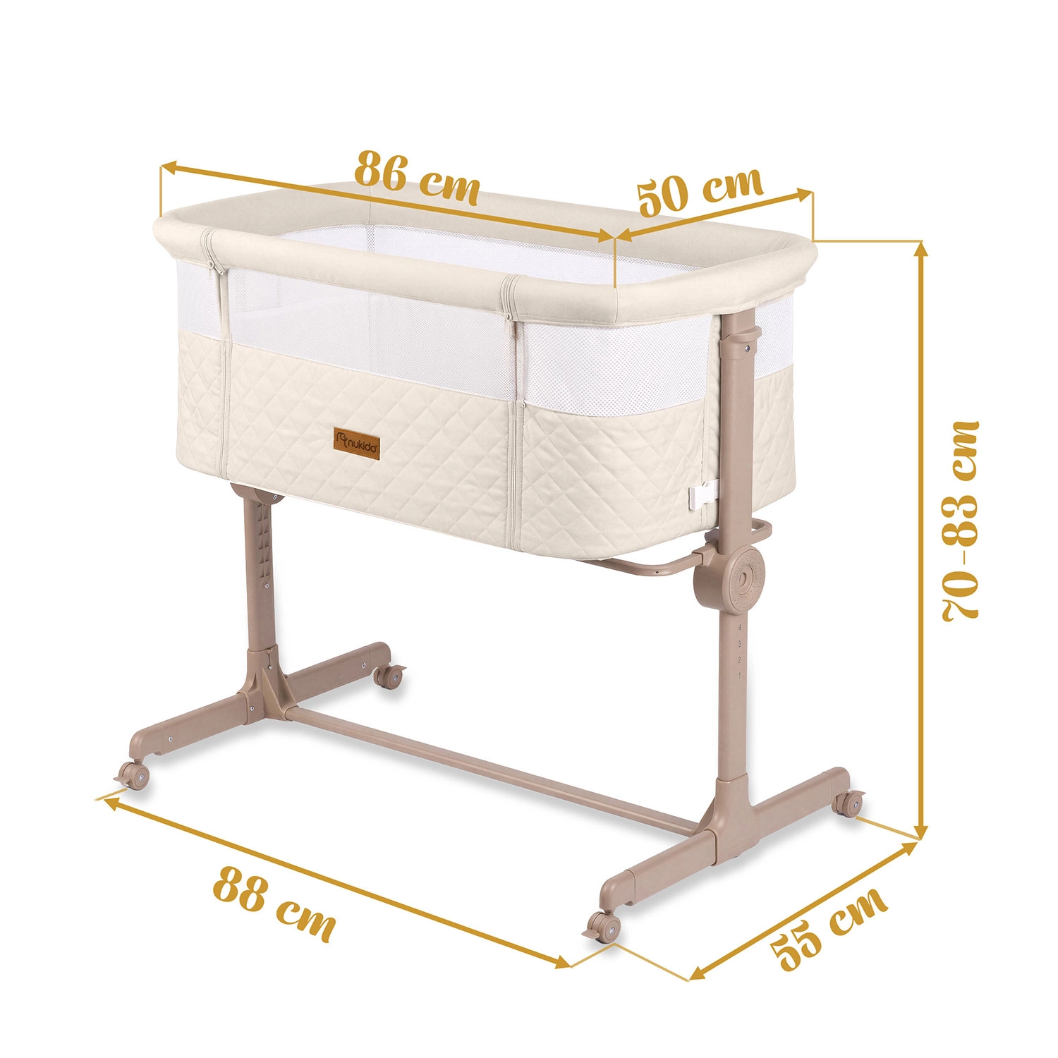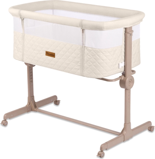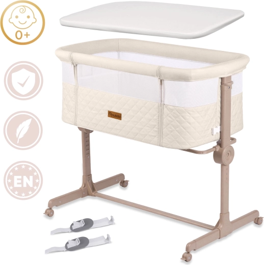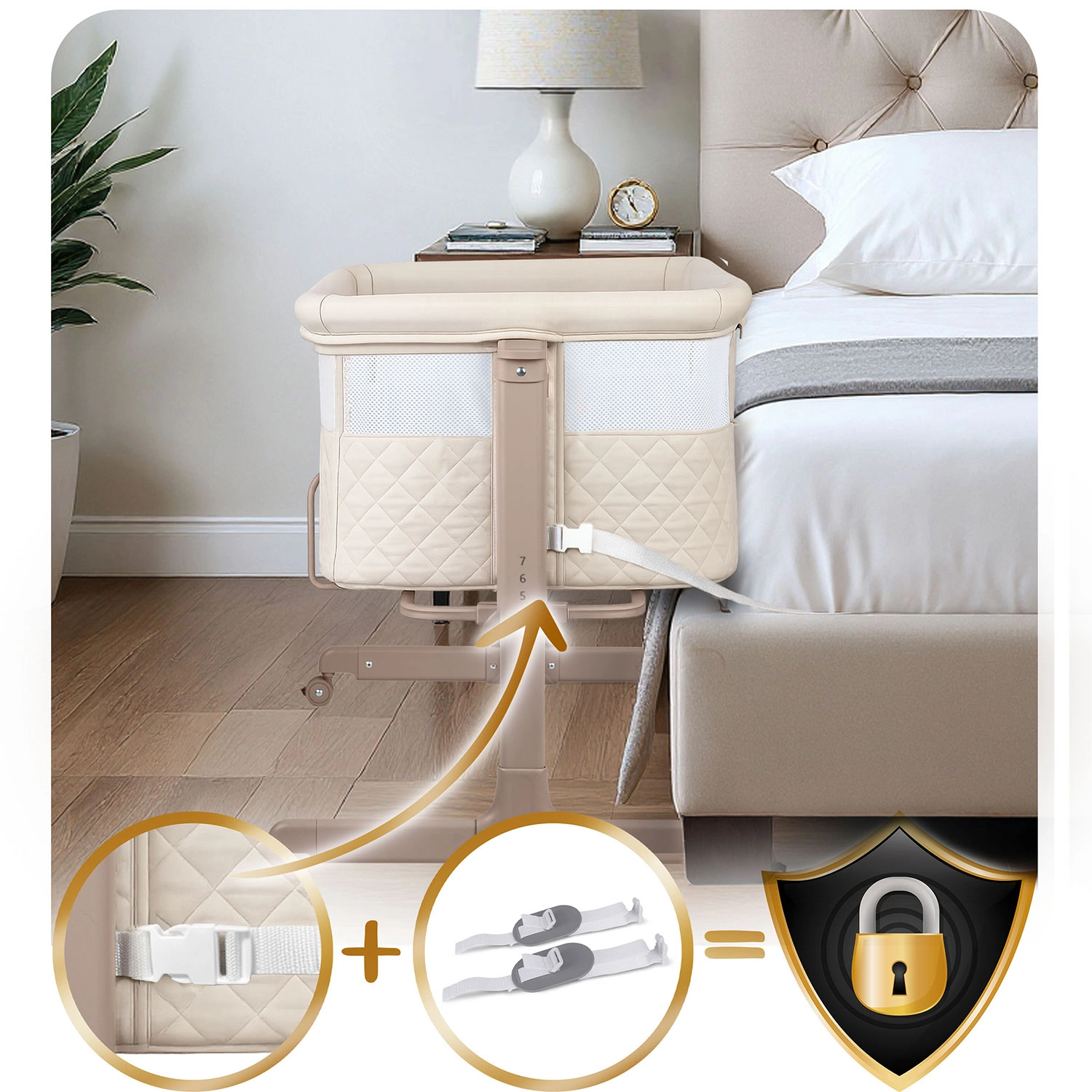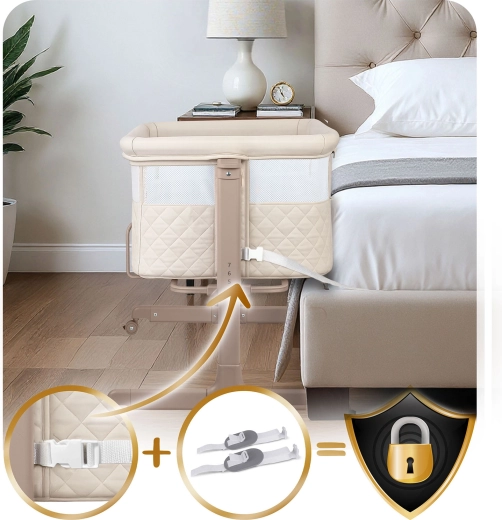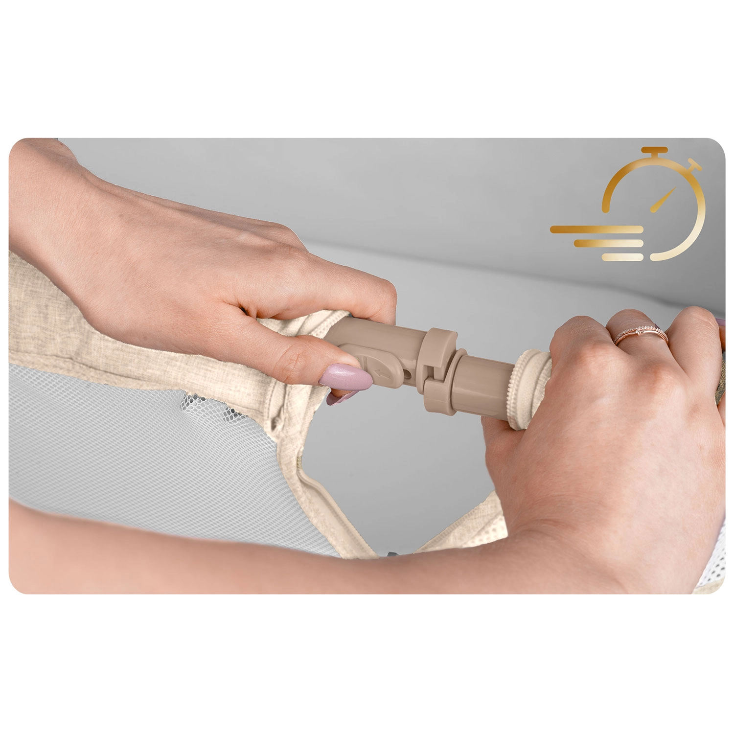 Boční panel na zip se otevírá směrem ven, aby jej dítě neotevřelo. Upevňovací pásy pevně spojí postýlku s lůžkem rodičů pro maximální stabilitu.