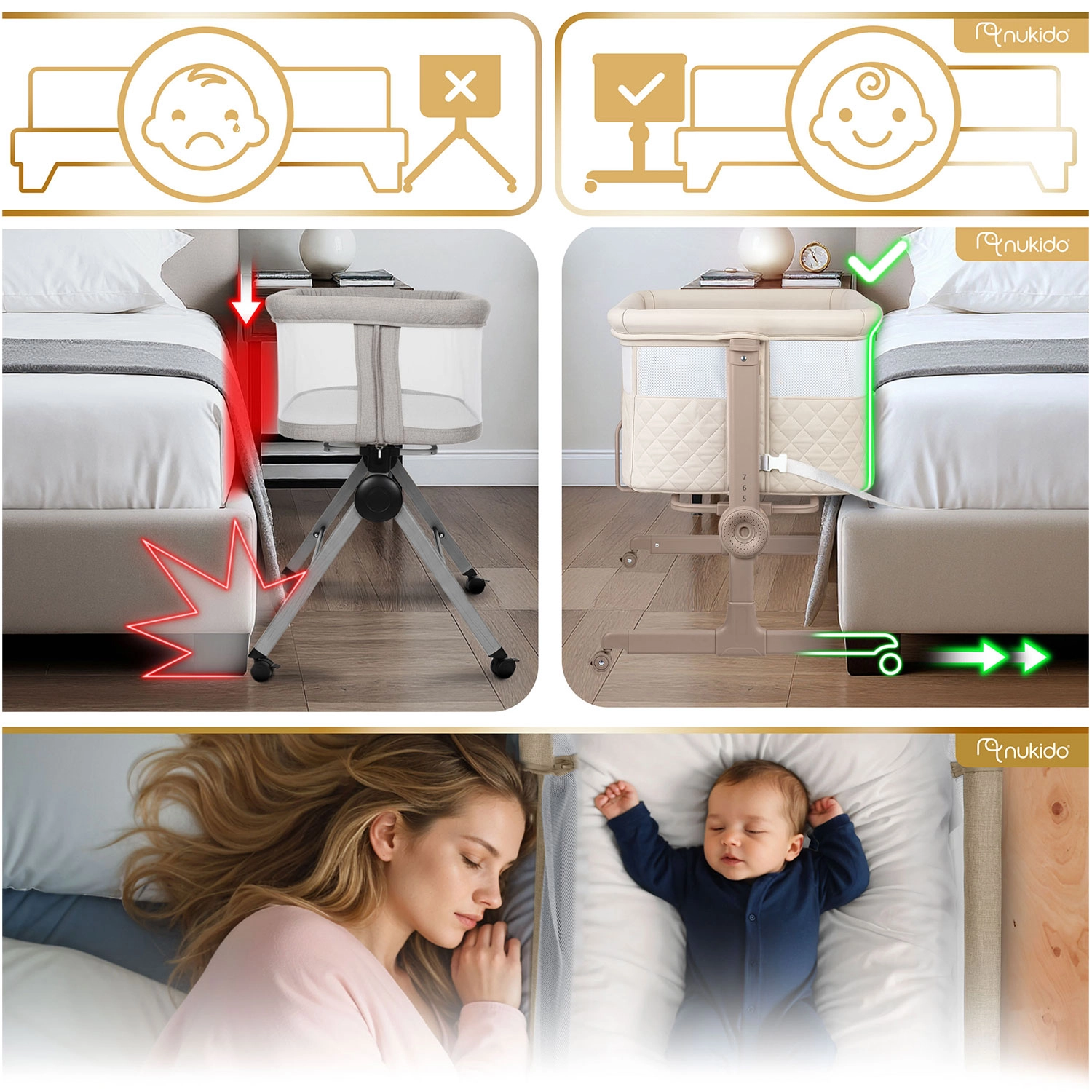 NUKIDO přístavná postýlka je ideální pomocník pro první měsíce života – miminko spí bezpečně vedle rodičů, kteří mohou rychle reagovat na jeho potřeby. Díky nezávislé dvoustranné regulaci výšky (1–7) snadno zarovnáte postýlku s lůžkem a v případě potřeby jemně naklopíte ložnou plochu pro klidnější dýchání a zmírnění refluxu.