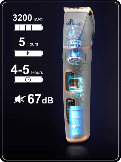 Díky baterii Li‑Ion 3200 mAh pracuje až 5 hodin na jedno nabití a přes USB‑C se plně dobije přibližně za 5 hodin. Regulace délky 0,8–2,0 mm přímo na strojku a čtyři hřebenové nástavce (3, 6, 9 a 12 mm) umožňují přesné přizpůsobení typu srsti i požadovanému stylu.
