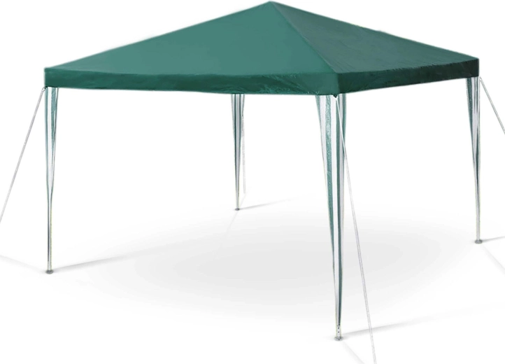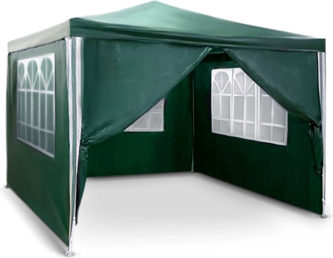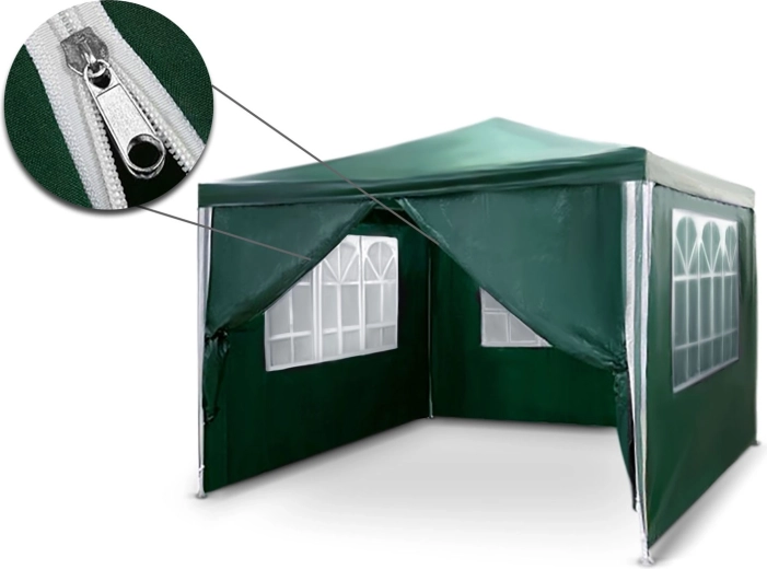 Zelený zahradní pavilon o rozměrech 3 × 3 × 2,45 m poskytne spolehlivý stín a ochranu při posezení na zahradě nebo při oslavách. Má odolnou ocelovou konstrukci s práškovým lakem, PE plachtu 100 g/m² s UV ochranou, čtyři bočnice včetně vstupu na zip a snadnou montáž se stabilizací pomocí kolíků a šňůr.