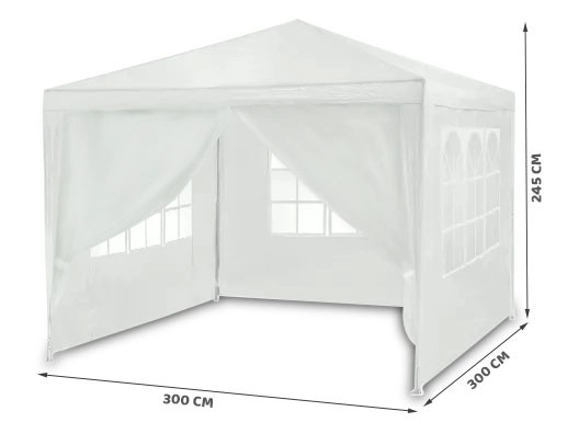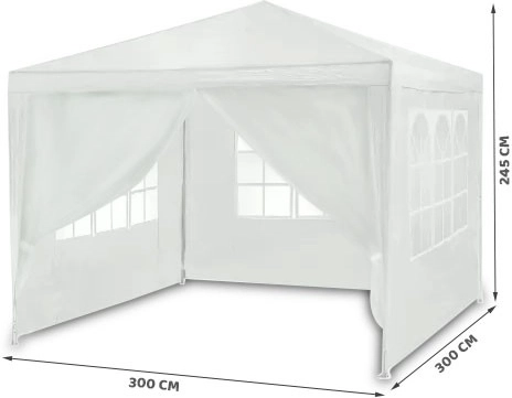 Zahradní pavilon 3 × 3 m nabídne krytý prostor 9 m² pro pohodlné stolování i odpočinek. Stabilní rám s práškovým lakem je odolný proti korozi, zatímco PE potah o gramáži 100 g/m² chrání před sluncem (UV) i lehkým deštěm. Bílá barva působí elegantně a snadno zapadne do každé zahrady či na terasu.
