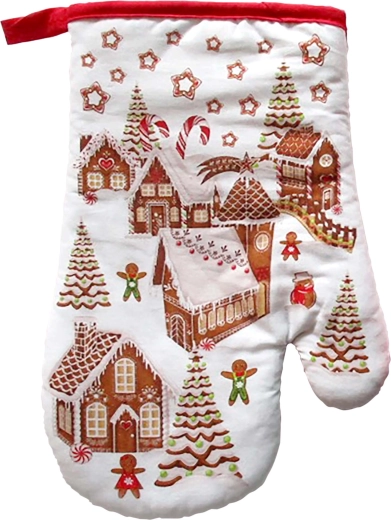 Decentní motiv perníčkové vesničky na bílé horní části krásně ladí s červenou spodní částí – ideální pro zimní a vánoční období i jako vkusný dárek pro milovníky pečení. Rukavice se snadno udržuje a je vhodná pro každodenní použití v domácnosti.