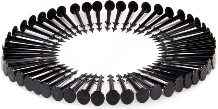 Součástí je 100 plastových kolíků s háčkovými hroty a širokou hlavou pro rychlou a stabilní fixaci textilie i na nerovném povrchu.